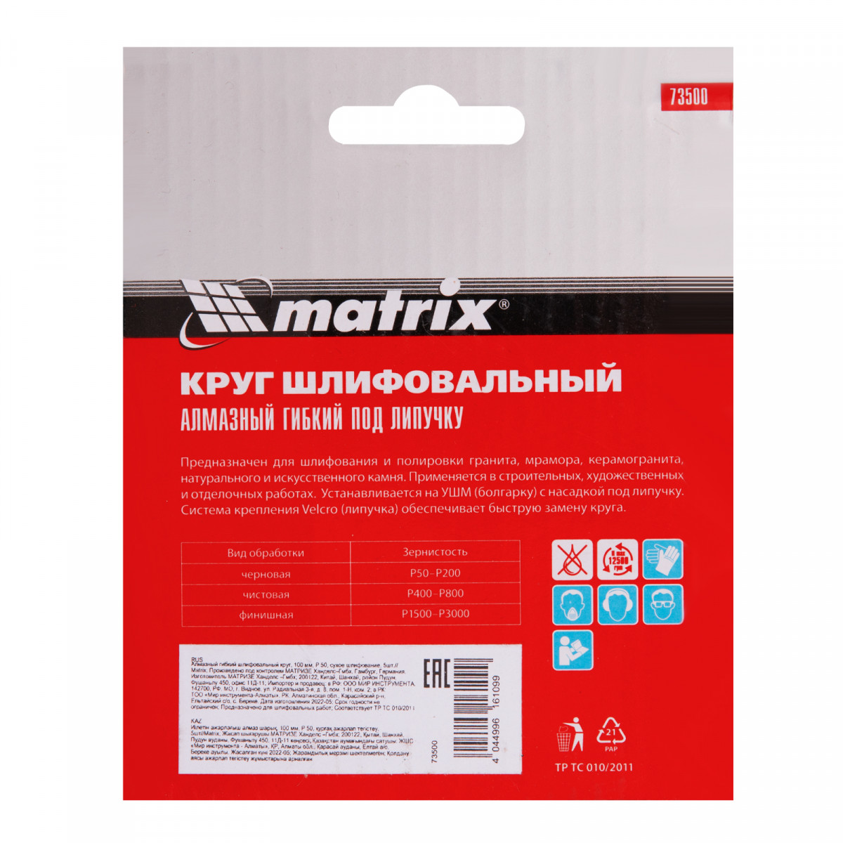 Алмазный гибкий шлифовальный круг Matrix 73500 диаметром 100 мм, с зернистостью P 50, 5 шт. в упаковке, предназначен для сухого шлифования преимущественно цветных и черных поверхностей из гранита, мрамора, природного и искусственного камня, керамогранита. Абразив с зернистостью P 50 снимает большой слой материала и используется для черновой шлифовки. Гибкий круг удобен для обработки предметов сложной формы. Оснастка используется на УШМ с установленной опорной тарелкой для АГШК.