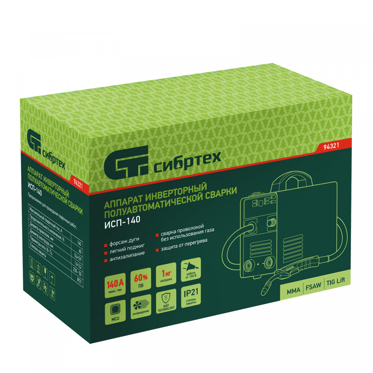 Инверторный аппарат полуавтоматической сварки Сибртех ИСП-140 94321 работает с максимальным сварочным током 140 А, время продолжительности включения составляет 60%. Аппарат позволяет работать в режимах MMA (сварка покрытым электродом диаметром до 4 мм), сварки флюсовой проволокой FCAW диаметром 0,8/0,9 мм без подачи газа и в режиме аргонодуговой сварки неплавящимся вольфрамовым электродом LIFT TIG (горелка в комплект не входит). Применение передовой инверторной технологии IGBT обеспечивает стабильный постоянный сварочный ток на выходе. Аппарат подходит для профессионального использования.