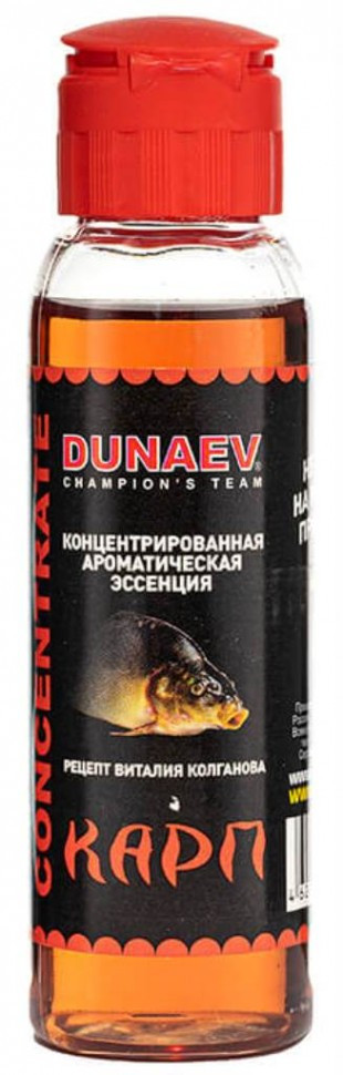 Dunaev Concentrate Карп – это высоконцентрированная жидкая вкусоароматическая добавка, введение которой в сухую или закормочную смесь дает возможность усилить или изменить основной аромат прикормки. Этот концентрат разработан для ловли карпа, сазана и карася. Отличается предельной натуральностью и интенсивностью ароматов. Сбалансированный состав компонентов, включая комплекс аминокислот, оказывает возбуждающее действие на вкусовые и обонятельные рецепторы рыбы, тем самым стимулируя ее аппетит. Основным показанием к применению концентрированных добавок является необходимость усиления запаха прикормочной смеси без изменения ее механических свойств. Эффективность и качество добавок Dunaev Concentrate Карп имеет высокий уровень. Подходит для любого вида ловли, в которой применяются прикормки. Одна бутылка средства рассчитана на 6-8 кг сухой смеси.