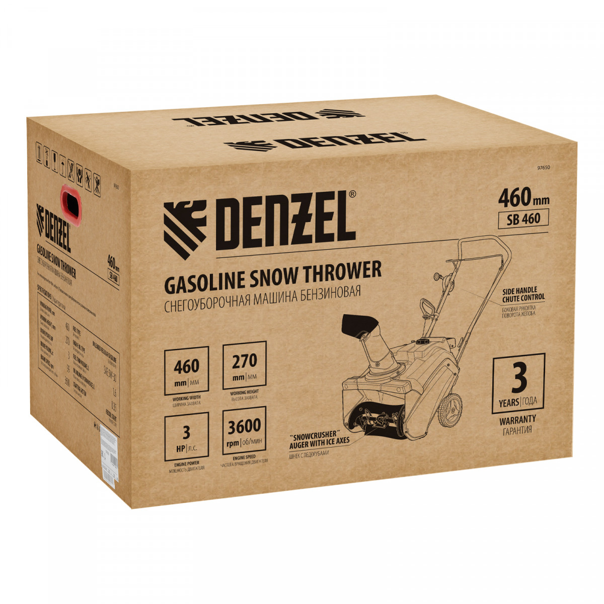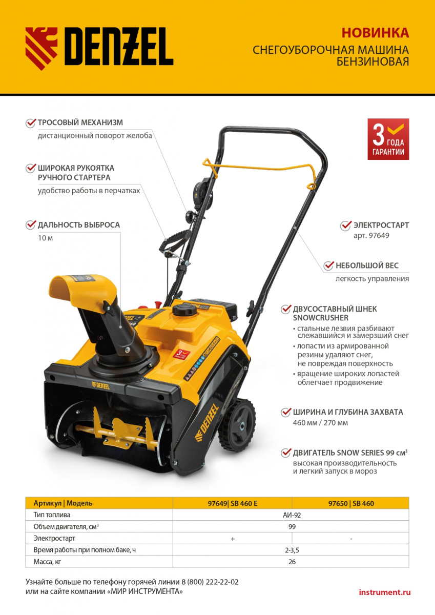 Бензиновая снегоуборочная машина Denzel SB 460 97650 с двигателем объемом 99 см3, ручным стартом и эксклюзивным шнеком Snow Crusher, предназначена для очищения от снега открытых ровных поверхностей: придомовой территории, дорожек, тротуаров, автомобильных парковок. Высота захвата составляет 27 см, ширина — 46 см, дальность выброса снега достигает 10 м. Машина значительно превосходит в производительности электрические модели, оставаясь компактной и мобильной.