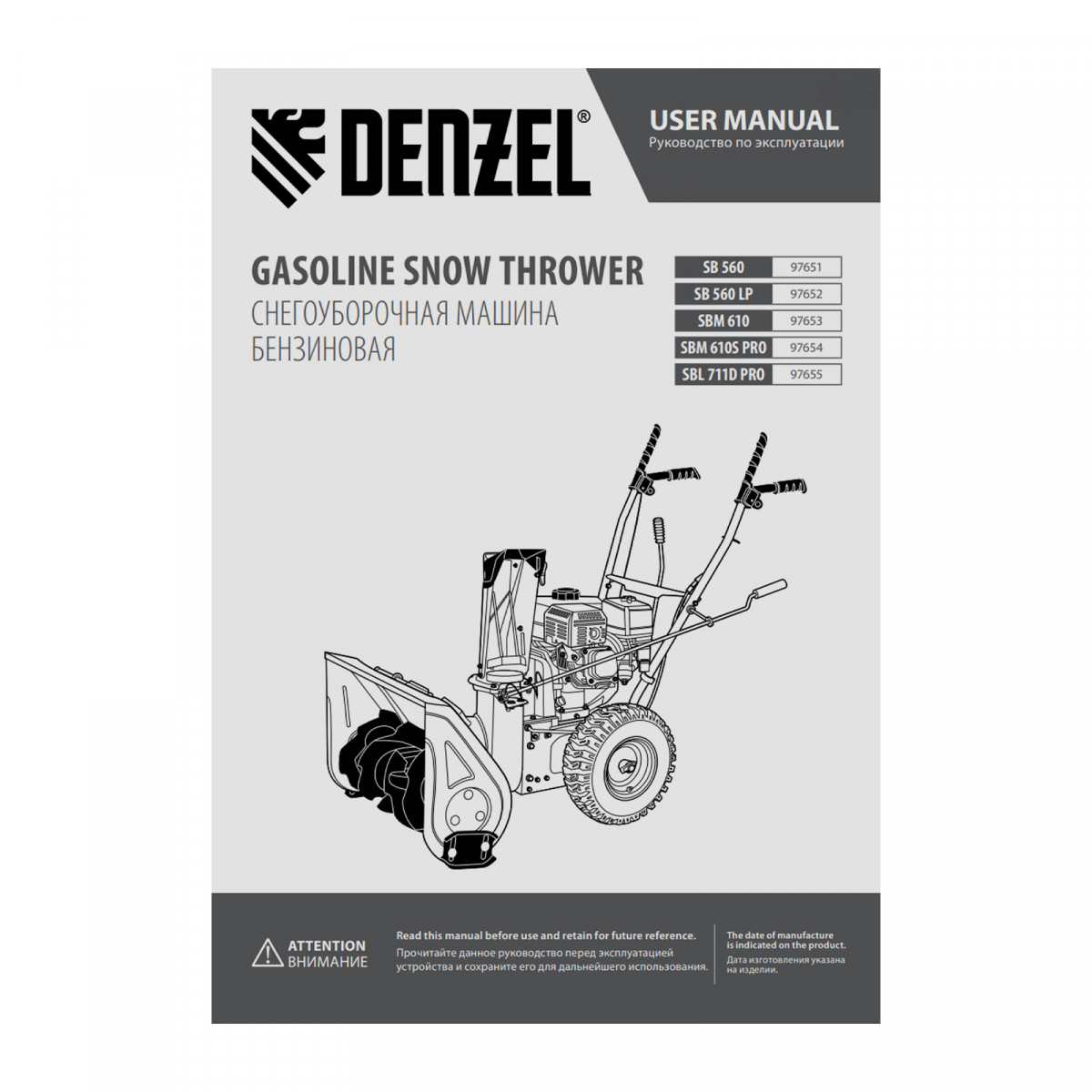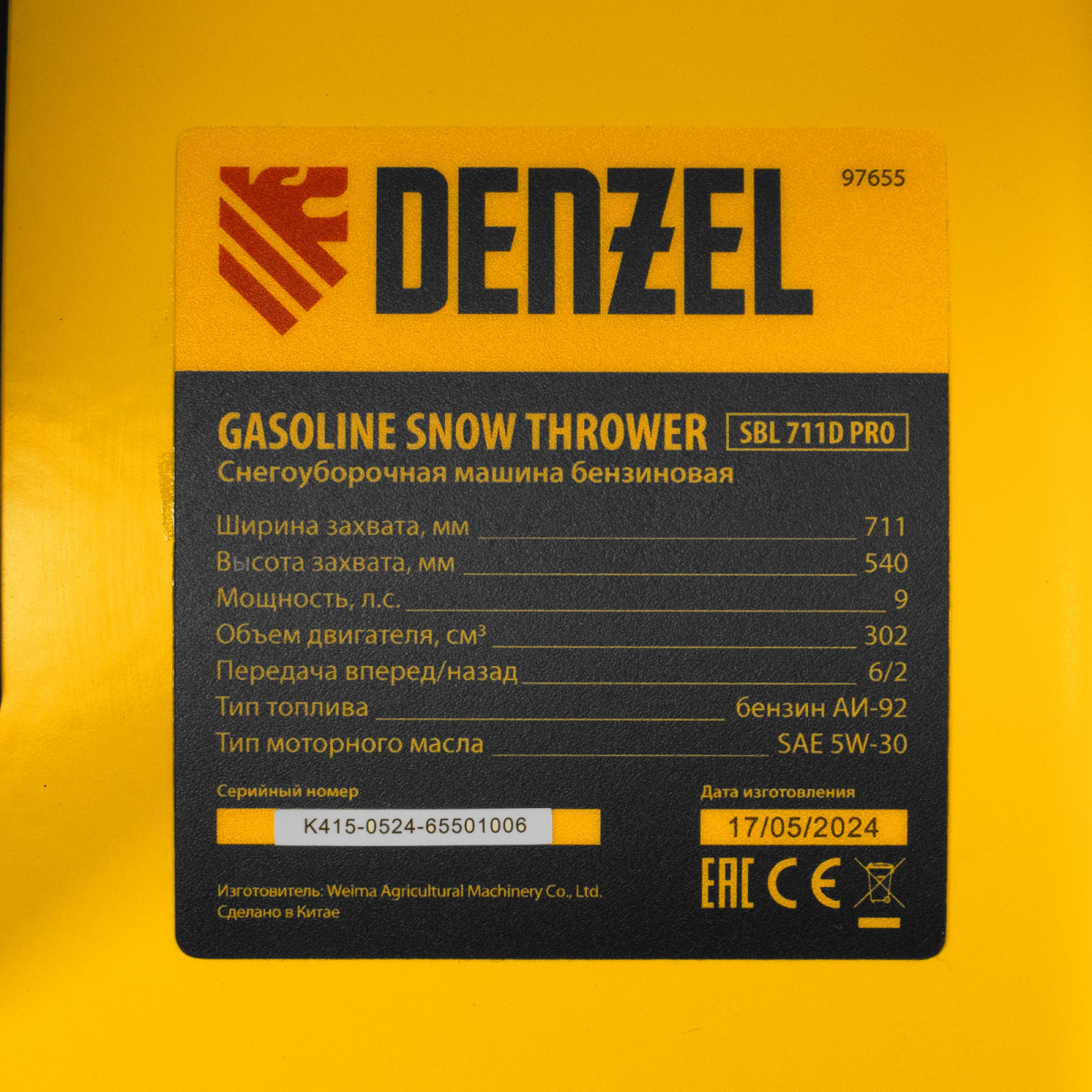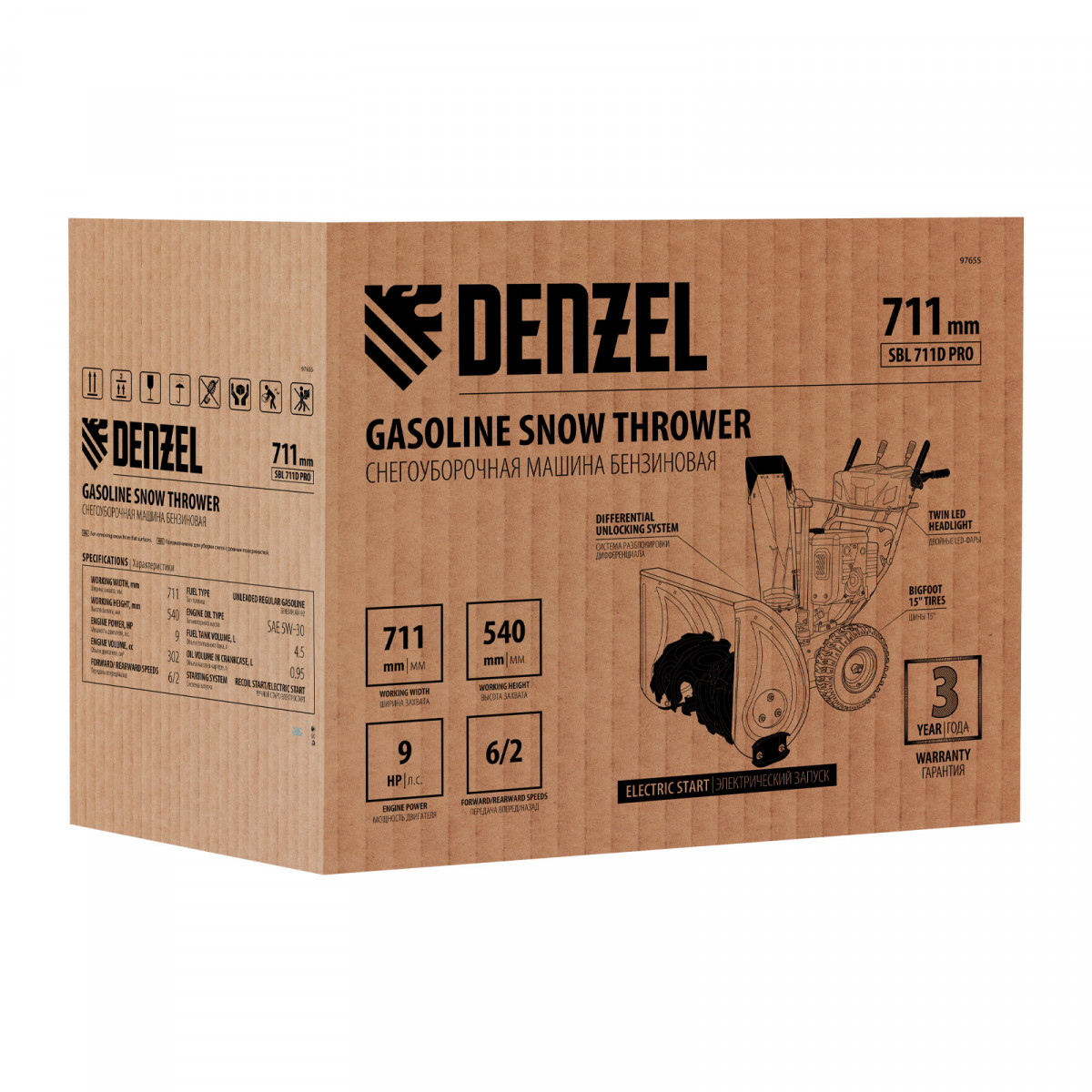 Бензиновая снегоуборочная машина SBL 711D PRO, 302cc, эл.старт, фара, обогрев, блок. дифф. Denzel
