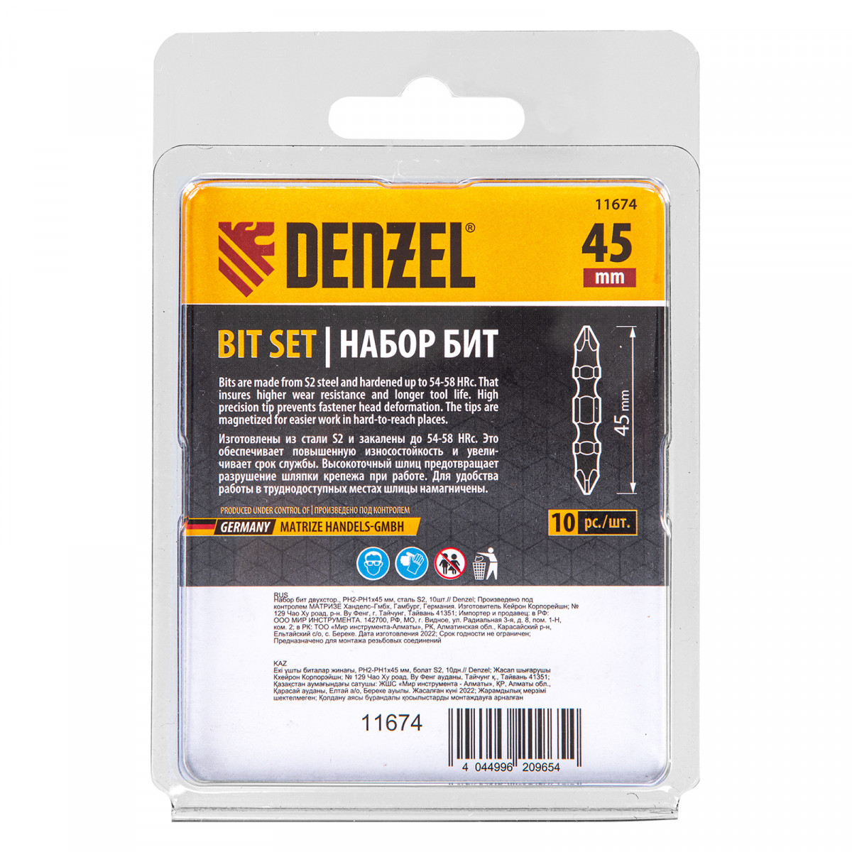 Набор двусторонних бит PH2-PH1 х 45 мм Denzel 11674 из стали S2 предназначен для монтажа/демонтажа саморезов по дереву и других резьбовых соединений с помощью шуруповерта. Насадки с двумя рабочими профилями самого востребованного типа Phillips подходят как для бытового, так и для профессионального использования.