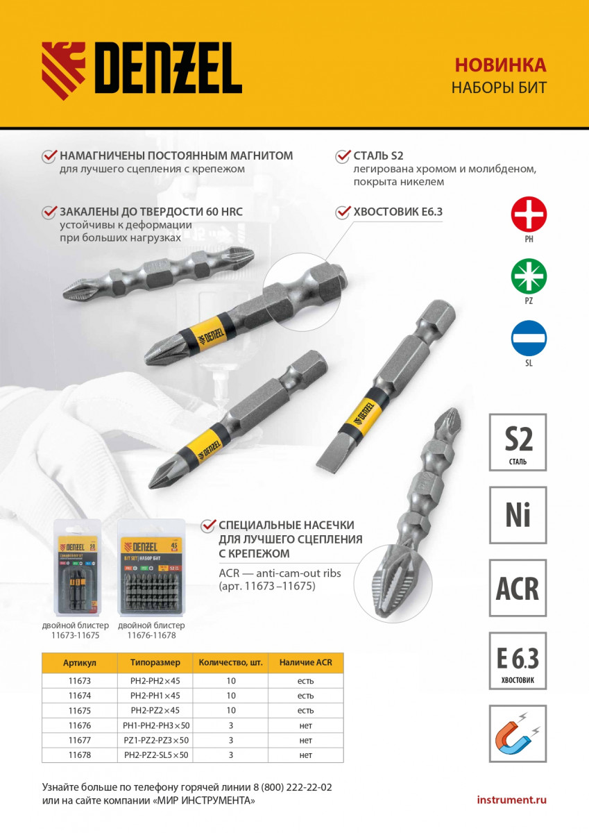 - Высокоточное исполнение — оптимальная геометрия шлица повышает срок службы бит и не дает им проскальзывать в крепеже.