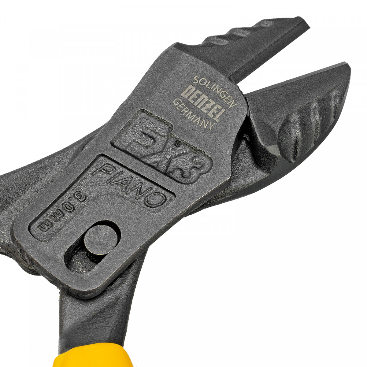 Усиленные бокорезы Denzel 17786 длиной 215 мм, с трехкомпонентными рукоятками, предназначены для разрезания кабелей, проводов, гвоздей и проволоки средней (750 Н/мм2) и высокой жесткости (1800 Н/мм2) диаметром 4,5 и 3,5 мм соответственно. Подходят для резки рояльных струн (предел прочности 2300 Н/мм2) диаметром до 3 мм. Успешно справляются не только с медными, алюминиевыми и пластмассовыми деталями, но и с более жесткими стальными элементами. Встроенный рычажный механизм и смещенный непосредственно к режущим кромкам шарнир увеличивают усилие реза на 50%.