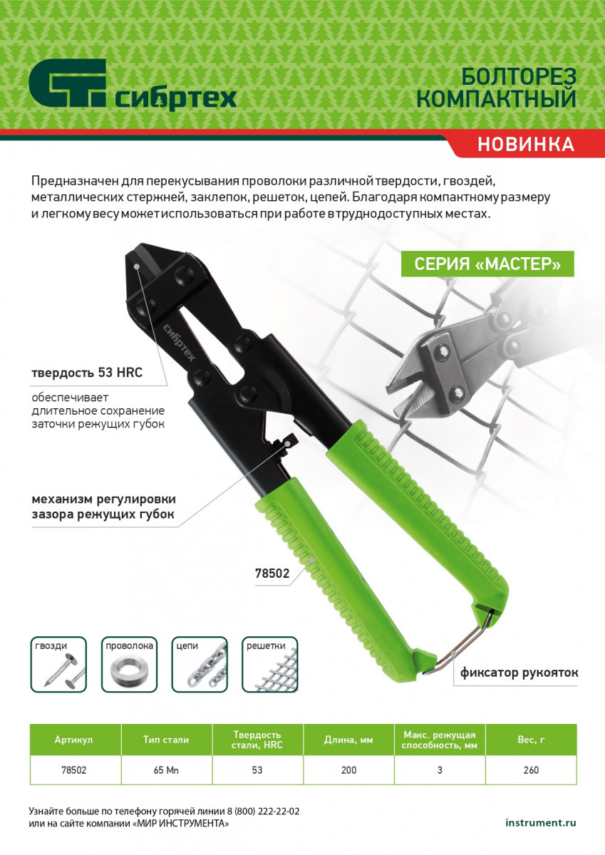 Компактный болторез Сибртех 78502 длиной 200 мм (8″), из стали 65Mn, предназначен для перекусывания гвоздей, болтов, проволоки различной твердости, а также металлических стержней, заклепок, цепей и решеток толщиной до 3 мм. Благодаря компактности и малому весу 260 г оптимален для работы в труднодоступных местах. Инструмент рекомендован профессиональным работникам для проведения слесарных, строительных, спасательных работ, будет полезен и в быту.