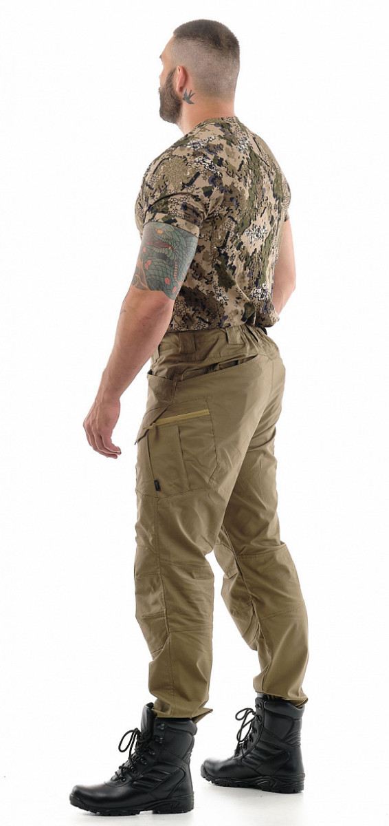 Брюки «Файтер» классического прямого кроя. Застежка на молнию и пуговицу. Пояс по спине собран на резинку, есть шлевки под ремень. Стрелка спереди застрочена. Карманы на бедрах и сзади объемные, застегиваются на листочку с липучкой.