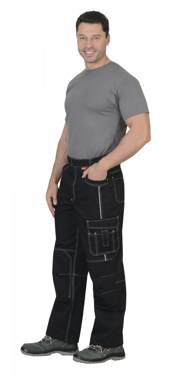 Брюки прямые, на притачном поясе, с застёжкой спереди на тесьму "молния", с боковыми внутренними карманами, с часовым карманом, на задних половинках с отрезной кокеткой, двумя накладными карманами и карманами под инструменты.