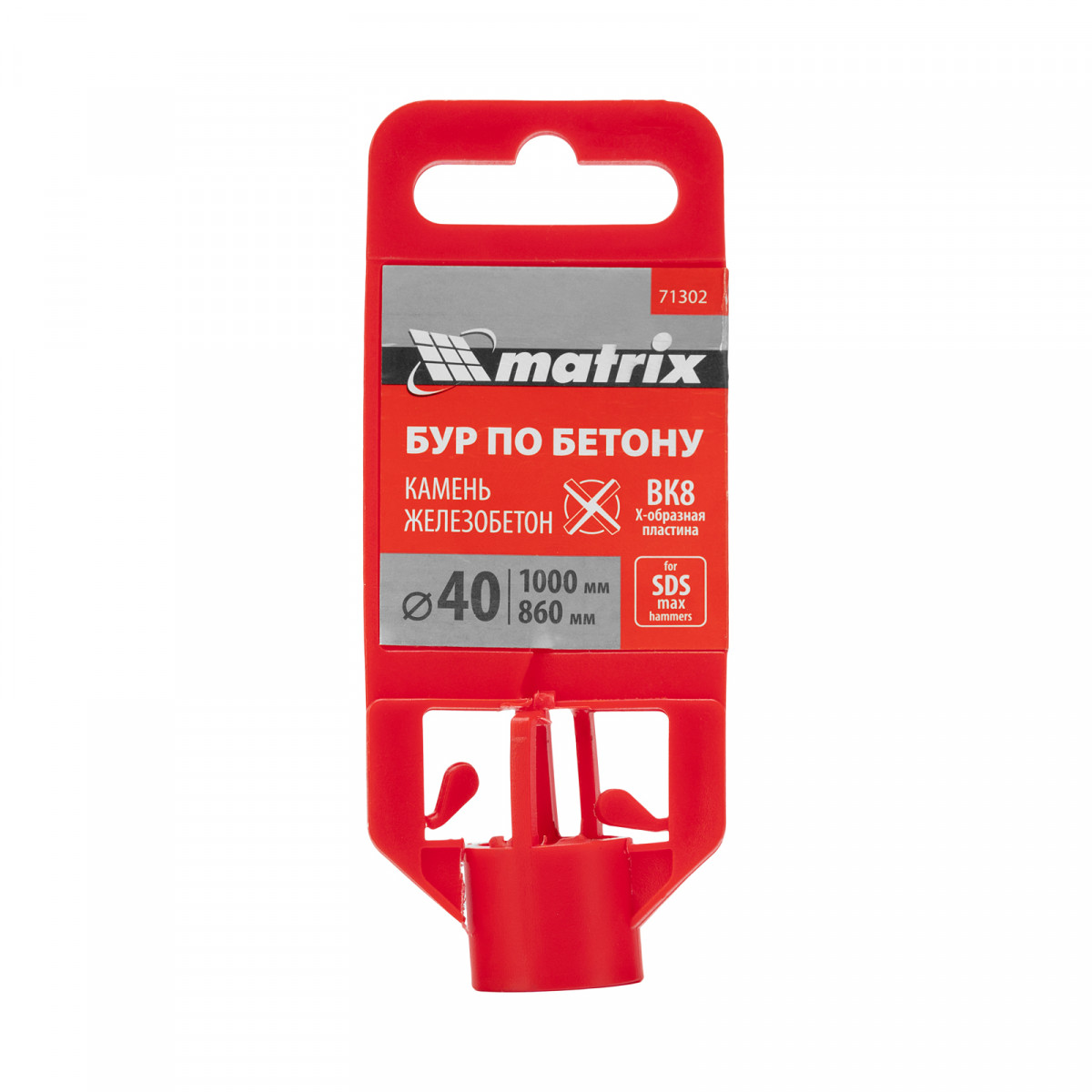 Бур по бетону Matrix 71302 длиной 1000 мм, с хвостовиком SDS MAX и крестовой пластиной, — оснастка для перфораторов высокой мощности, предназначенная для получения отверстий диаметром 40 мм в стенах, полах, перекрытиях. Крестовая пластина в сочетании с усиленной системой крепления SDS MAX позволяет успешно работать с камнем, кирпичом и бетоном, в том числе армированным. Бур используется во время проведения строительных работ, незаменим для прокладки коммуникаций: газо- и водопроводов, электросетей и т.д.
