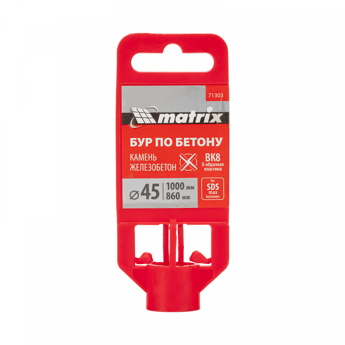 Бур по бетону Matrix 71303 длиной 1000 мм, с хвостовиком SDS MAX и крестовой пластиной, — оснастка для перфораторов высокой мощности, предназначенная для получения отверстий диаметром 45 мм в стенах, полах, перекрытиях. Крестовая пластина в сочетании с усиленной системой крепления SDS MAX позволяет успешно работать с камнем, кирпичом и бетоном, в том числе армированным. Бур используется во время проведения строительных работ, незаменим для прокладки коммуникаций: газо- и водопроводов, электросетей и т.д.