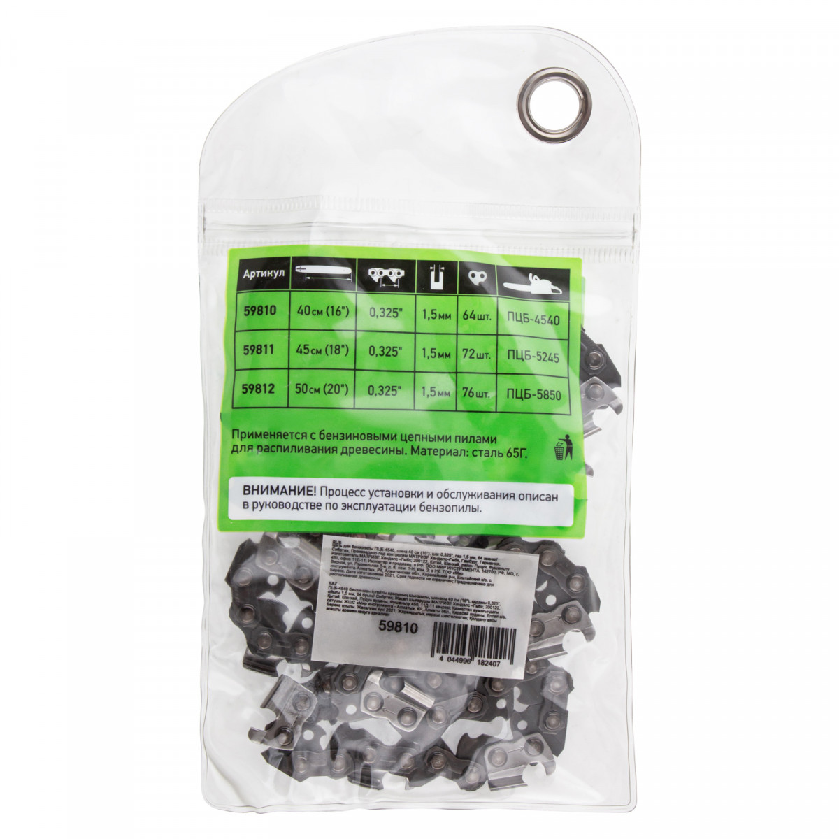 Цепь Сибртех 59810 с шириной паза 1,5 мм используется с бензопилой ПЦБ-4540, состоит из 64 звеньев с шагом 0,325″ и надевается на пильную шину длиной 40 см (16″). Оптимальна для частного применения в бытовых условиях, на небольших стройках, в лесу, на рыбалке и в походах. Благодаря низкому уровню вибраций пилу с установленной цепью удобно удерживать в руках.