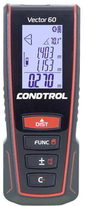 Лазерный дальномер Condtrol Vector 60 1-4-104 используется для измерения расстояния как в помещении, так и на улице. Пригодится строителям, монтажникам, отделочникам и домашним мастерам.Прибор обладает большим количеством функций: трекинг (непрерывное измерение), сложение/вычитание, вычисление площади и объема, вычисления по теореме Пифагора. Расстояние может измеряться с передней или задней стенки корпуса, со штатива, откидной скобы. Встроенная функция Bluetooth позволяет передавать результаты на смартфон или планшет