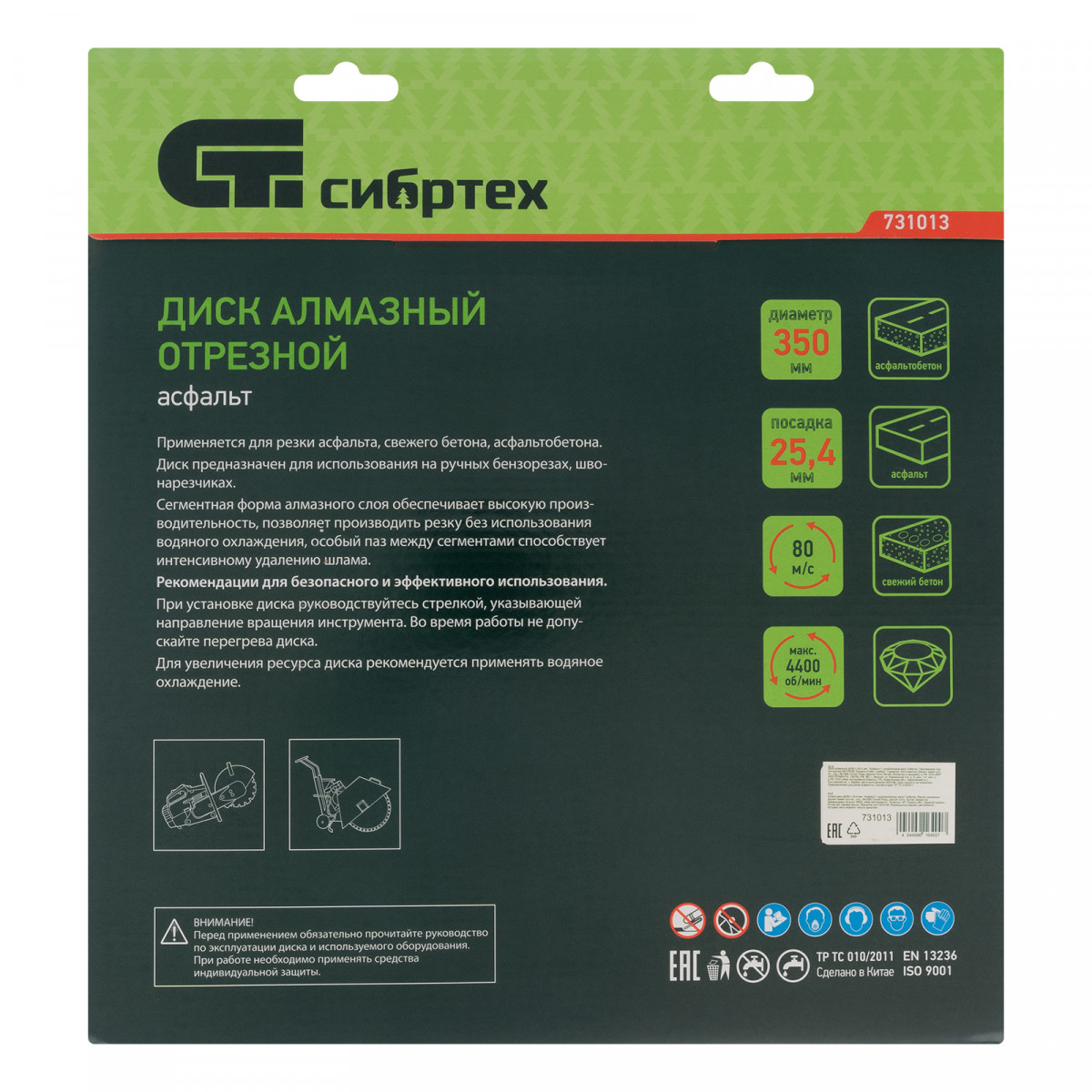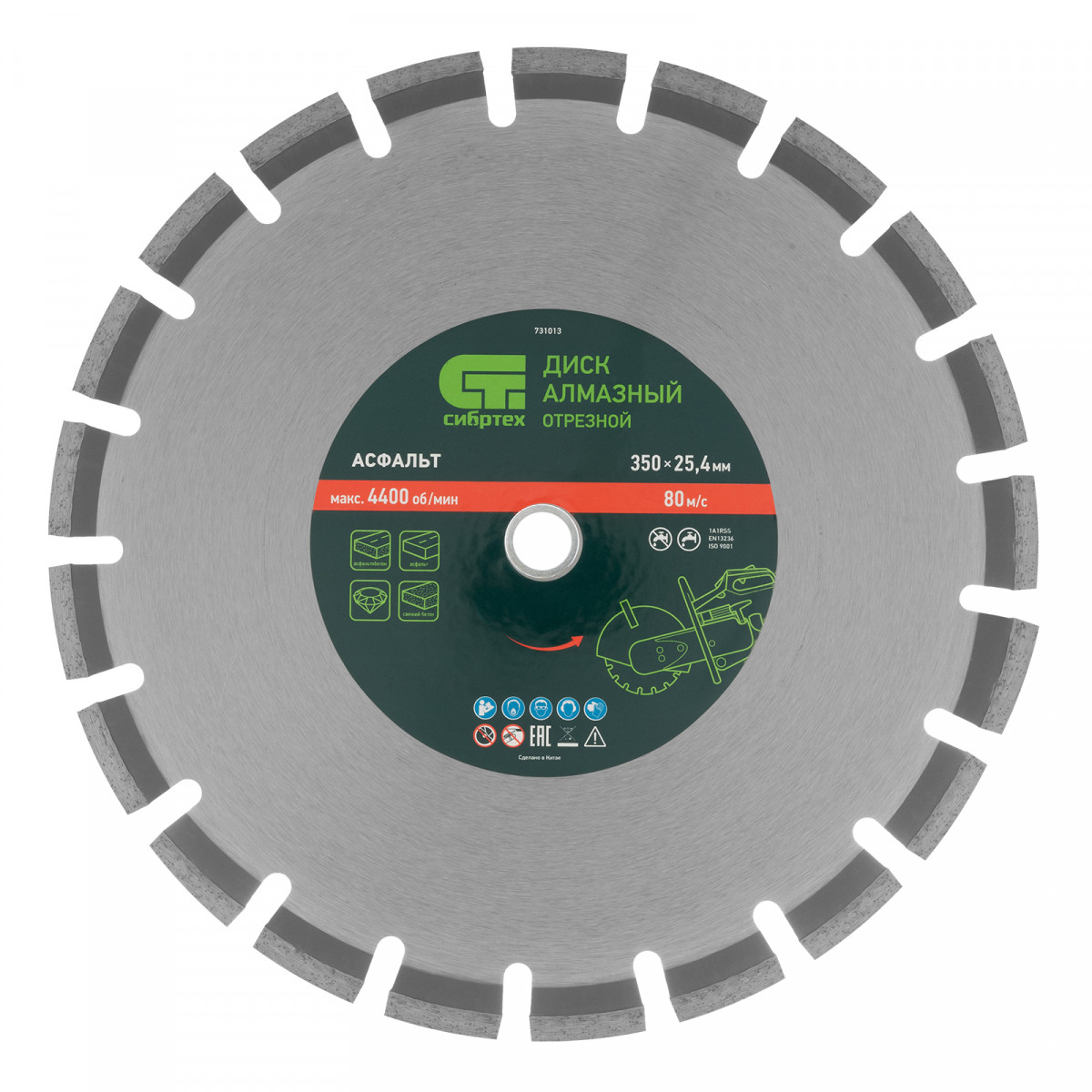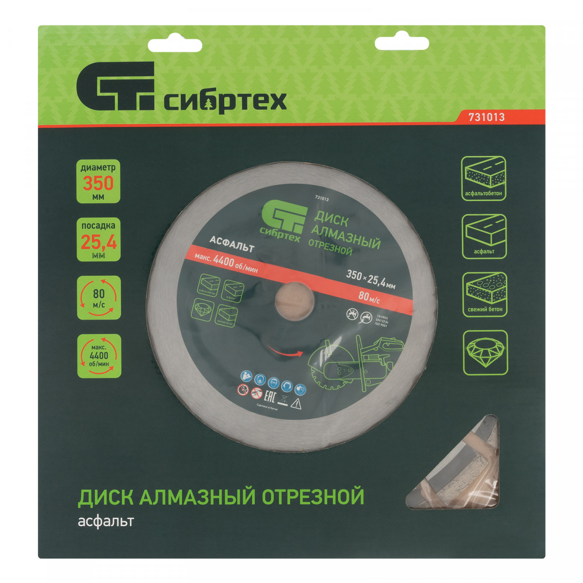 Алмазный диск Сибртех «Асфальт» 731013 диаметром 350 х 25,4 мм используется для сухого и мокрого реза асфальта, свежего бетона, асфальтобетона, камня, кирпича, абразивных материалов. Устанавливается на ручной бензорез или швонарезчик с посадочным диаметром 25,4 мм. Диск устойчив к деформациям и выдерживает значительные нагрузки. Для увеличения ресурса диска рекомендуется проводить мокрое резание.