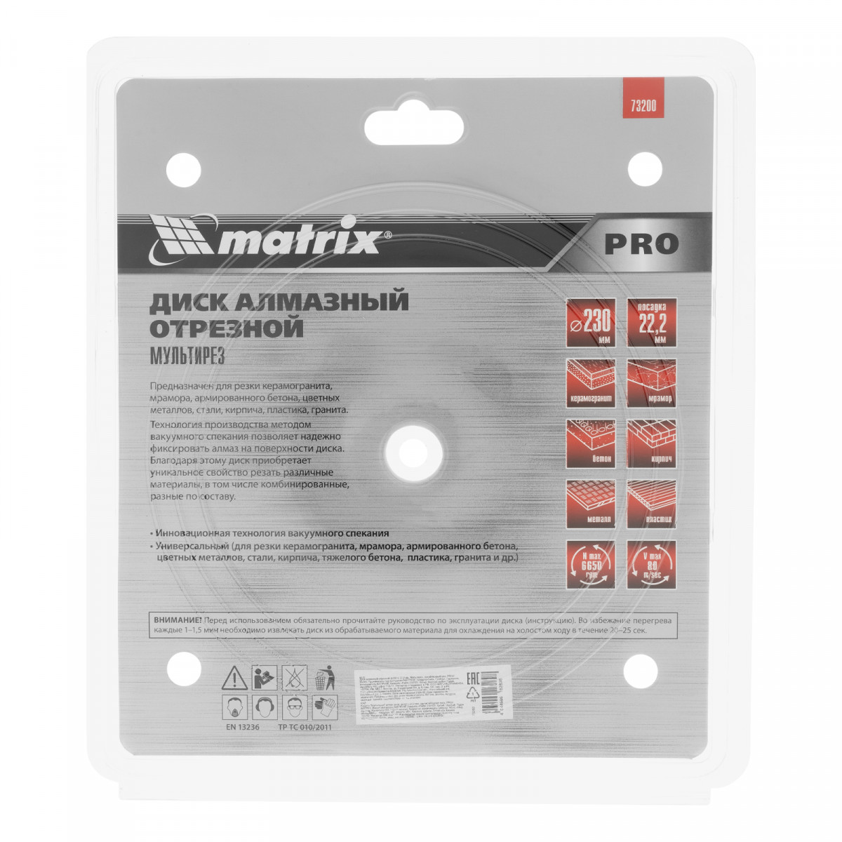 Алмазный отрезной диск Matrix PRO Мультирез 73200 диаметром 230 х 22,2 мм применяется для сухого и мокрого резания бетона любой твердости, железобетона, гранита, кирпича, металла, древесины, пластика и других материалов. Используется в качестве универсального режущего инструмента в профессиональной сфере, например, строительными, специальными службами, сотрудниками МЧС. К работе с диском необходимо приступать после ознакомления с руководством пользователя.