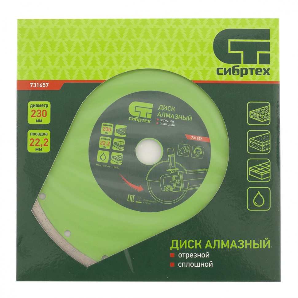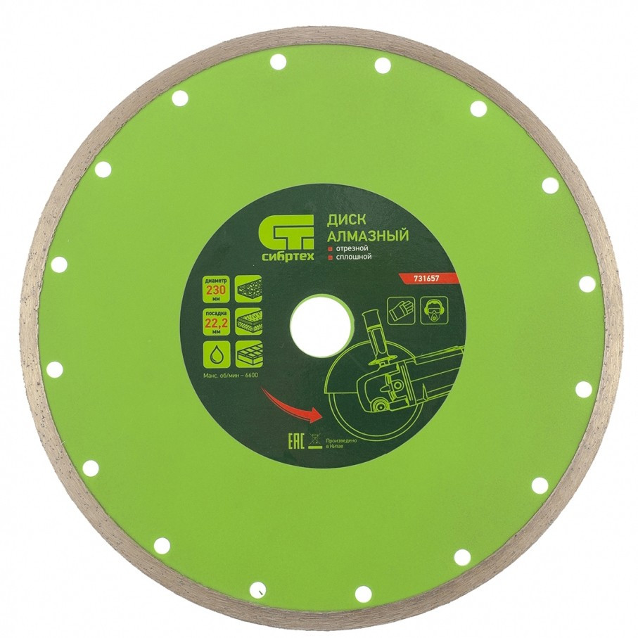 Алмазный отрезной сплошной диск Сибртех 731657 диаметром 230 х 22,2 мм применяется для мокрой резки керамогранитной, керамической плитки, а также мрамора и камня. Используется в качестве оснастки для болгарок и плиткорезов с посадочным диаметром 22,2 мм. Диск обладает хорошим рабочим ресурсом и рассчитан на долгую службу. Рез материалов необходимо проводить с использованием водяного охлаждения.