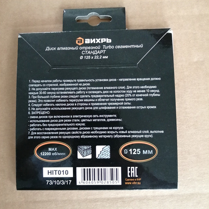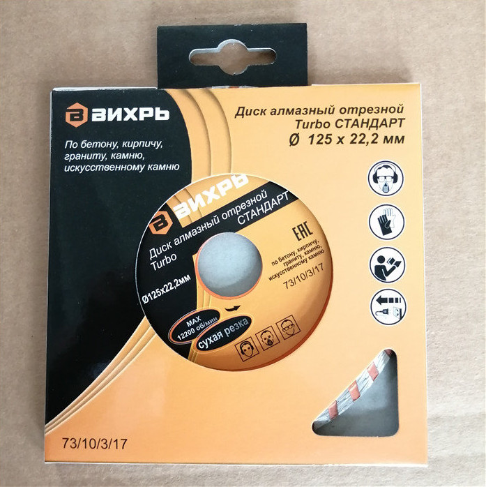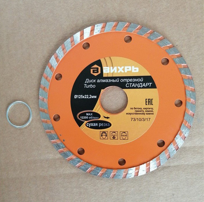 Диск алмазный отрезной Турбо СТАНДАРТ, 125 х 22,2 мм, сухая резка Вихрь - это алмазный отрезной диск, который используется совместно с угловыми шлифмашинами (болгарками) для сухой резки гранитных, бетонных, кирпичных и каменных изделий.