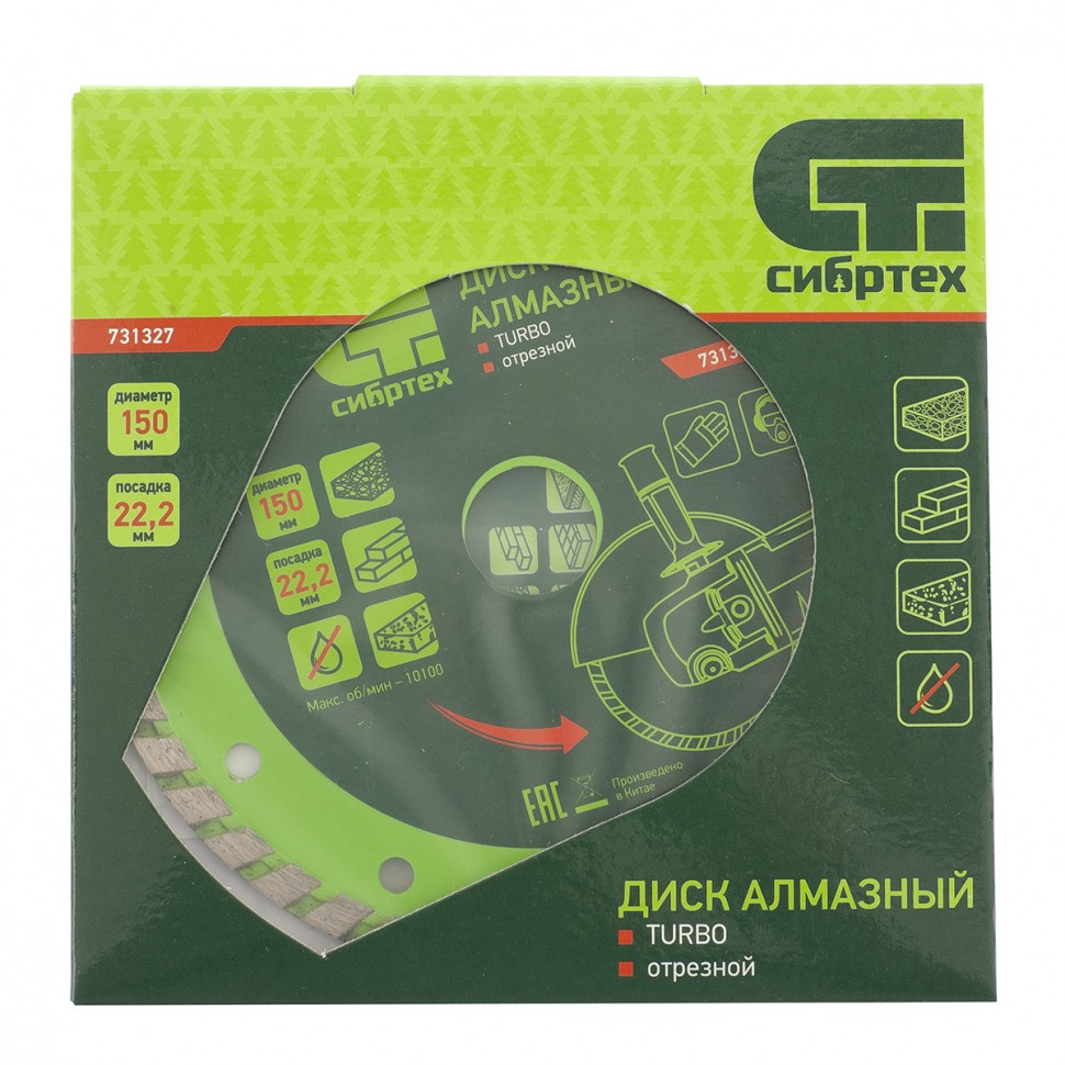 Алмазный отрезной диск Сибртех Turbo 731327 для сухой резки, диаметром 150 х 22,2 мм, устанавливается на углошлифовальную машину. Позволяет резать твердые материалы: бетон, железобетон, камень, песчаник. Диск предназначен для бытового использования.