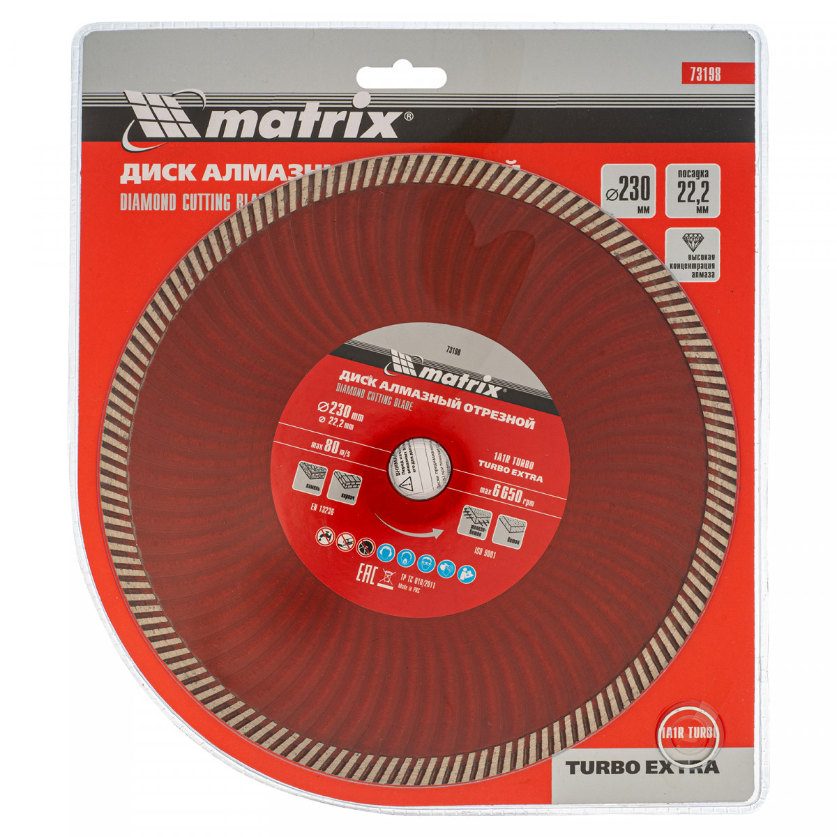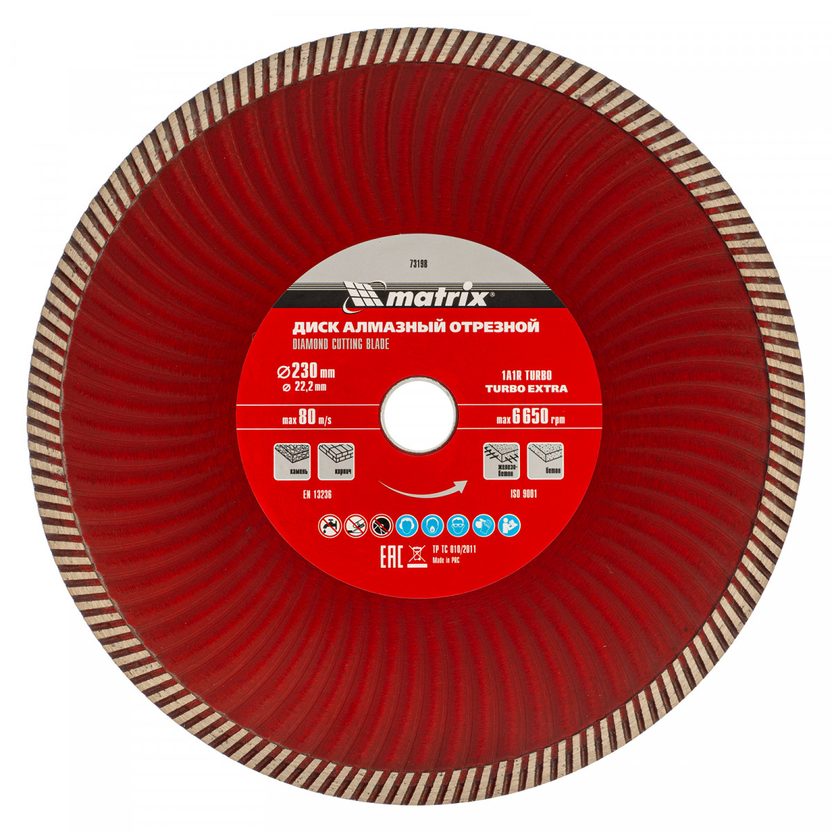 Отрезной алмазный диск Matrix Turbo Extra 73198, 230 х 22,2 мм, используется для сухой резки бетона, железобетона, кирпича, тротуарной плитки, шлакоблока и камня. Он устанавливается на углошлифовальные машины с посадочным диаметром 22,2 мм. Обеспечивает высокую скорость реза, поэтому подходит для интенсивного применения.