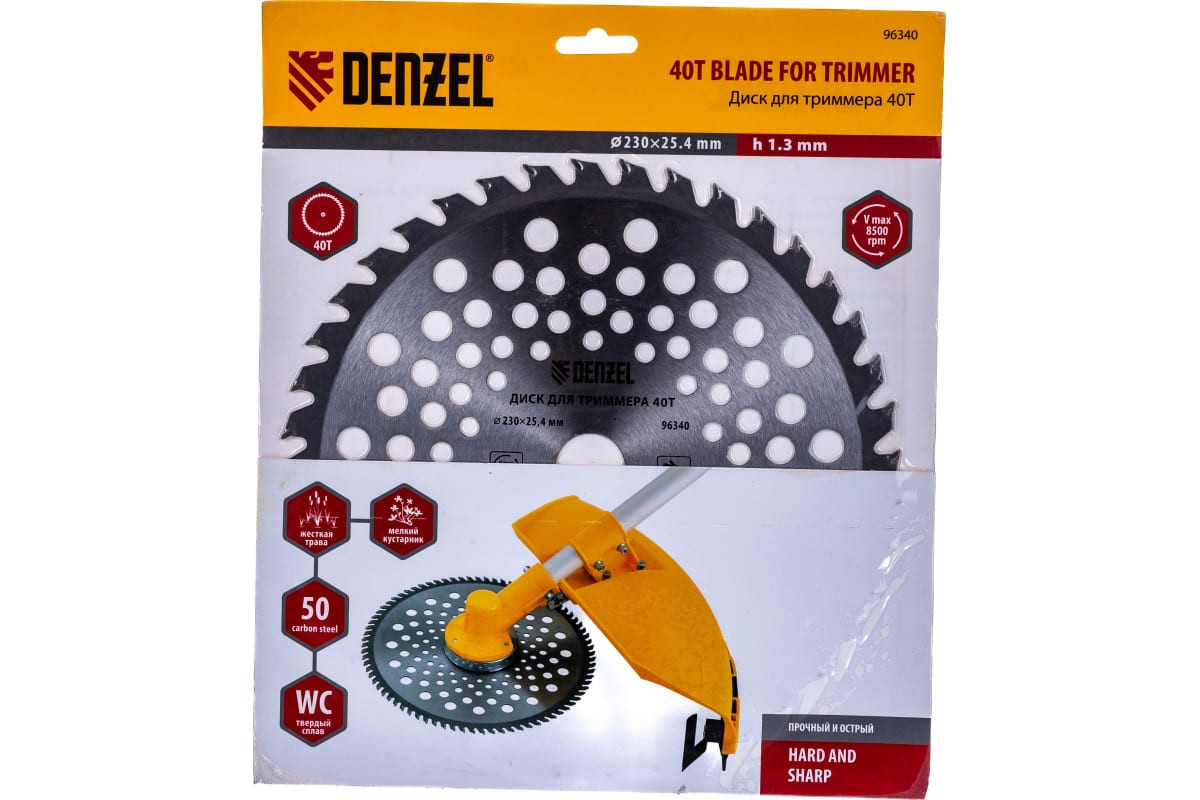 Диск для триммера Denzel 96340 внешним диаметром 230 мм и внутренним — 25,4 мм, толщиной 1,3 мм, с 40 зубьями, совместим со всеми бензотриммерами Denzel и Сибртех, а также электротриммерами Denzel 96611 и 96612. Он используется для скашивания травы, подпиливания веток кустарника и молодых деревьев.