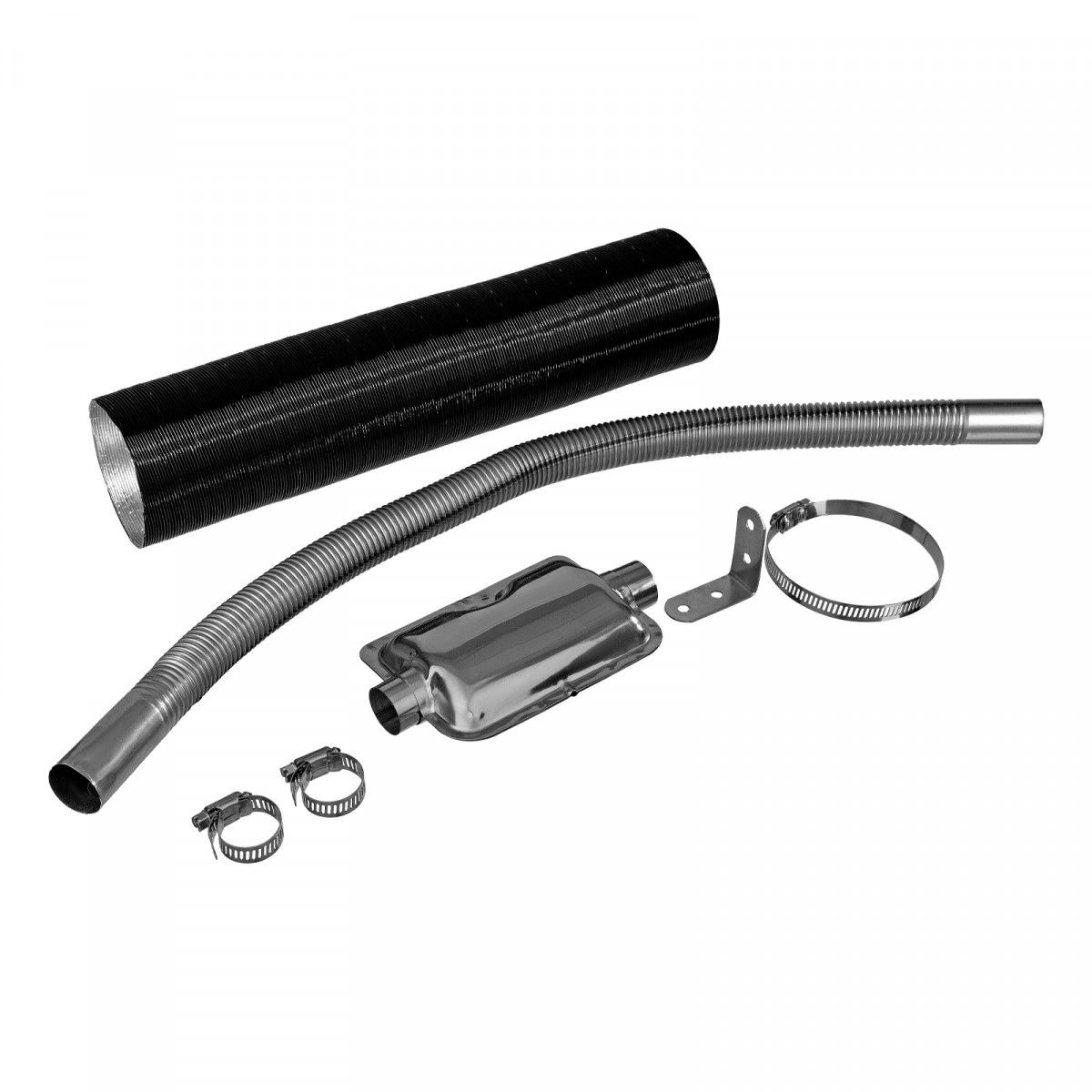 • Полная комплектация — к пушке прилагаются гофротруба и труба для отвода выхлопных газов, кабель питания от аккумулятора с клеммами 5 м, блок питания от сети 230 В (длина шнура 3 м), хомуты и глушитель.