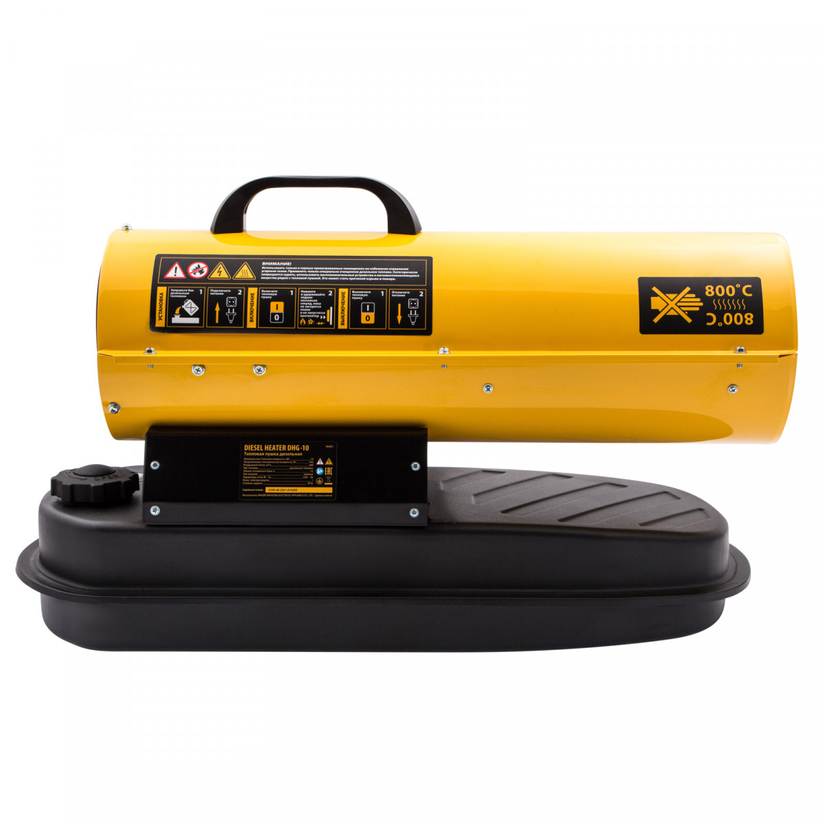 Дизельная тепловая пушка Denzel DHG-10 96481 мощностью 10 кВт и производительностью 300 куб. м/ч предназначена для прямого нагрева воздуха в цехах, ангарах, хранилищах и других нежилых помещениях с хорошей вентиляцией. Максимальная площадь обогрева составляет 100 кв. м. Пушка служит эффективным источником тепла в полярных экспедициях. Пригодится также на строительной площадке для прогрева бетона, просушки стен и разморозки траншей. Для заправки может использоваться любое дизельное топливо: летнее, зимнее и арктическое. Преимущества Встроенная система безопасности — подача топлива прекращается в случае затухания пламени, перегрева и отключения питания. Эффективность — благодаря системе прямого нагрева и теплоотражающему экрану воздух в помещении прогревается быстро и равномерно. Низкий расход топлива — продолжительность работы без дозаправки составляет 12 часов. Датчик уровня топлива — своевременная заправка бака позволяет избежать перерывы в работе. Защита от засорения — встроенный фильтр грубой очистки препятствует попаданию в топливную систему посторонних частиц. Подтвержденное качество — на устройство действует гарантия 3 года.