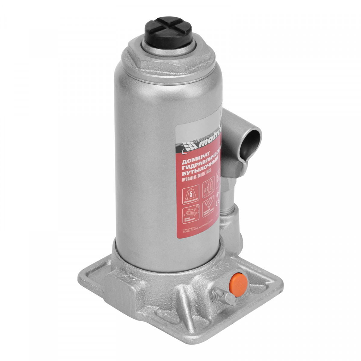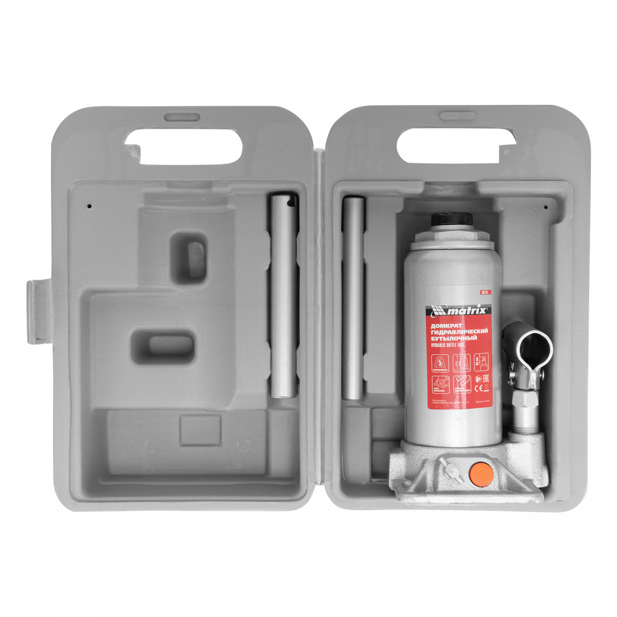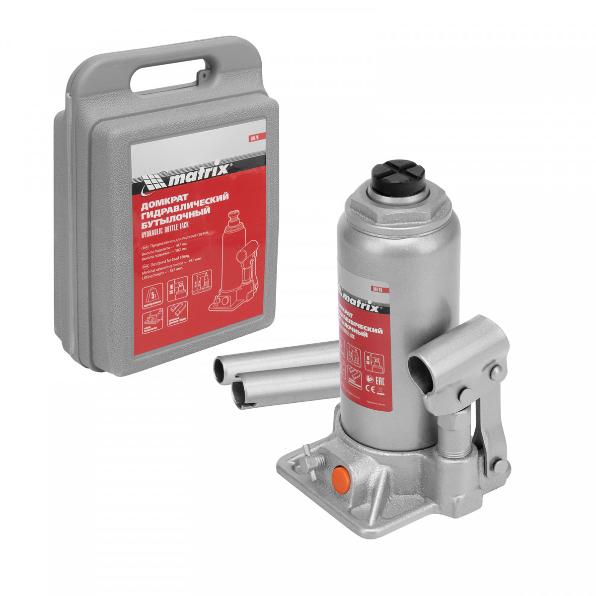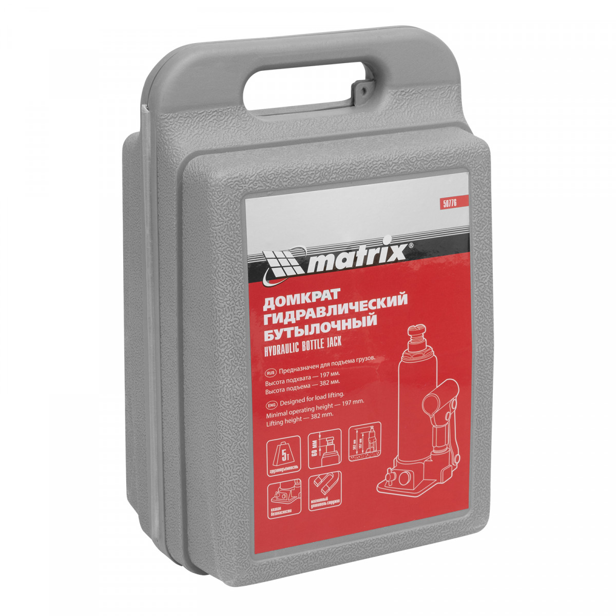 Домкрат гидравлический бутылочный, 5 т, h подъема 197-382 мм, в пластиковом кейсе Matrix