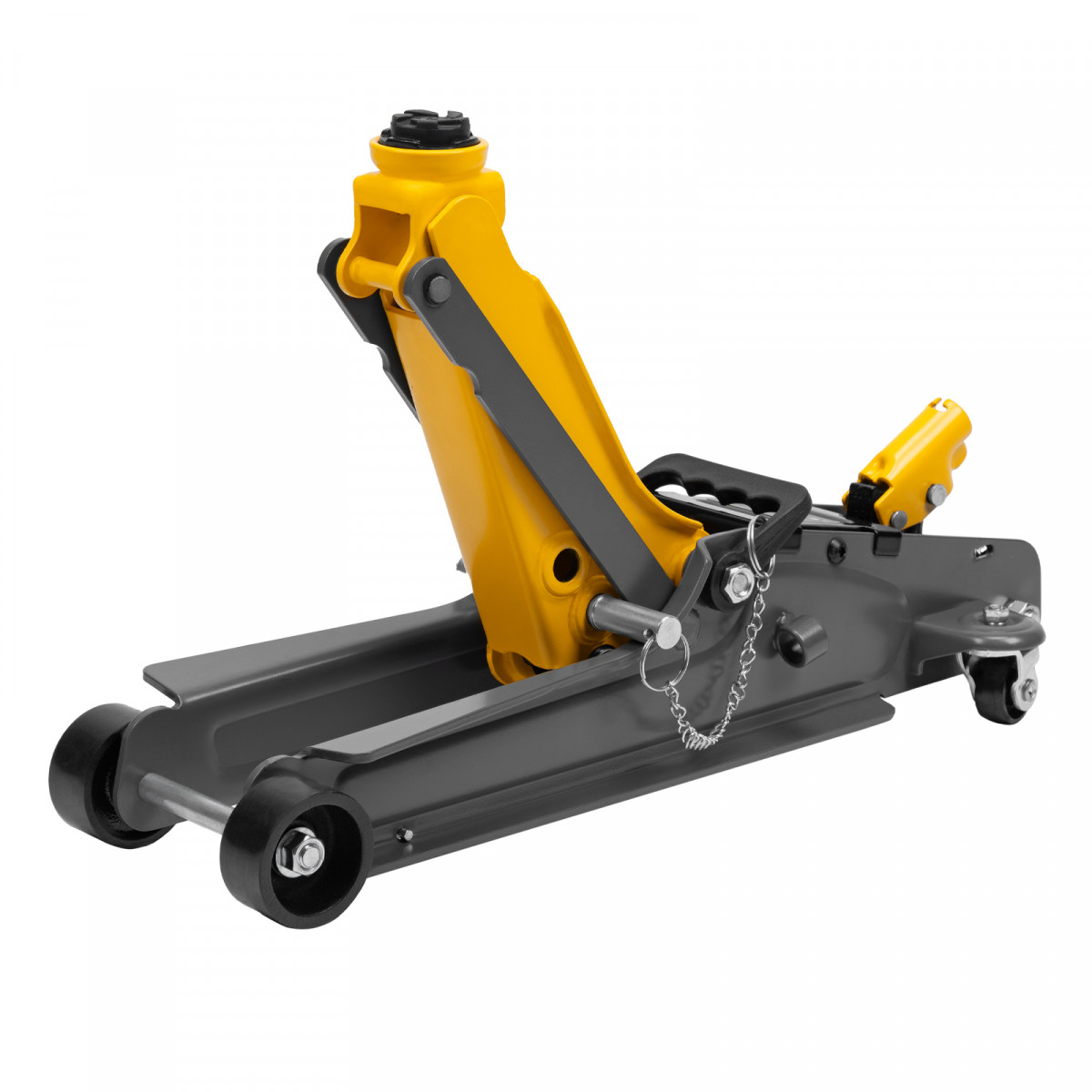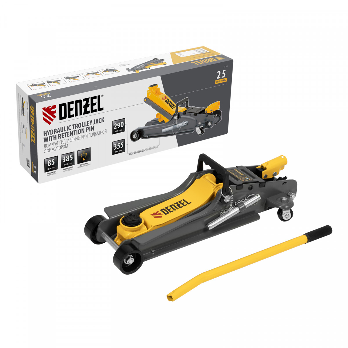 Гидравлический подкатной домкрат Denzel 51232 с фиксатором имеет высоту подхвата 85 мм и предназначен для плавного подъема грузов массой до 2,5 т на высоту до 385 мм. Страховочный штифт позволяет фиксировать подъемный рычаг на высоте 290 и 355 мм для безопасной работы. Домкрат пригодится владельцам легковых автомобилей с низким и стандартным клиренсом.
