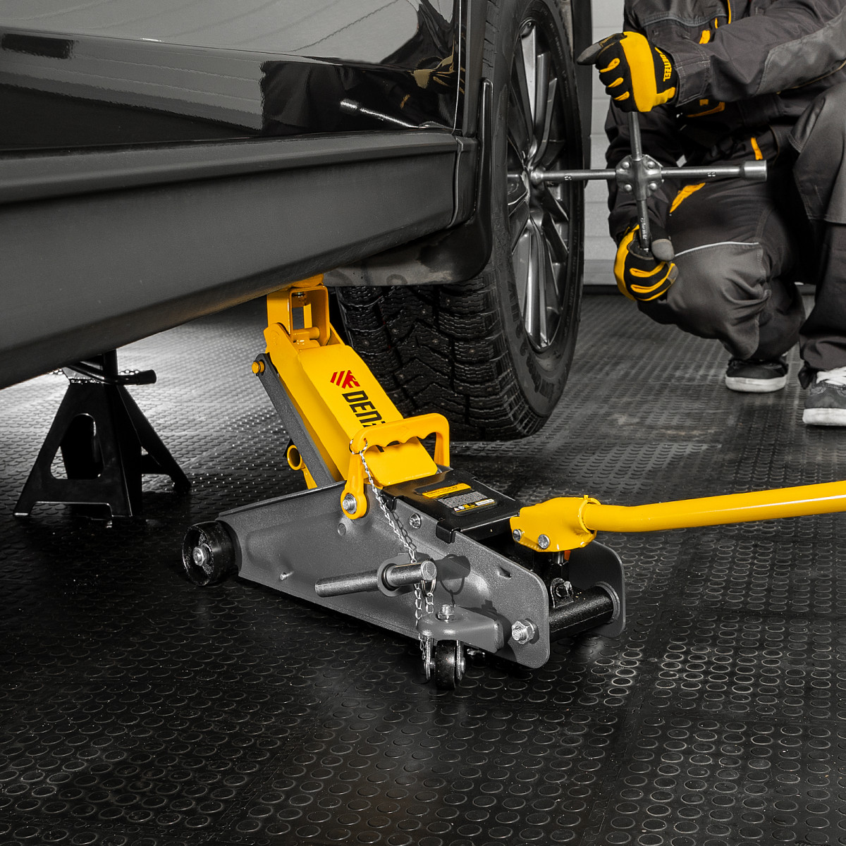Гидравлический подкатной домкрат с фиксатором Denzel 51156, с высотой подхвата 135 мм, предназначен для плавного подъема грузов массой до 2,8 т на высоту до 385 мм. Страховочный штифт позволяет фиксировать подъемный рычаг на высоте 305 и 370 мм для безопасной работы. Домкрат пригодится владельцам легковых автомобилей со стандартным клиренсом.