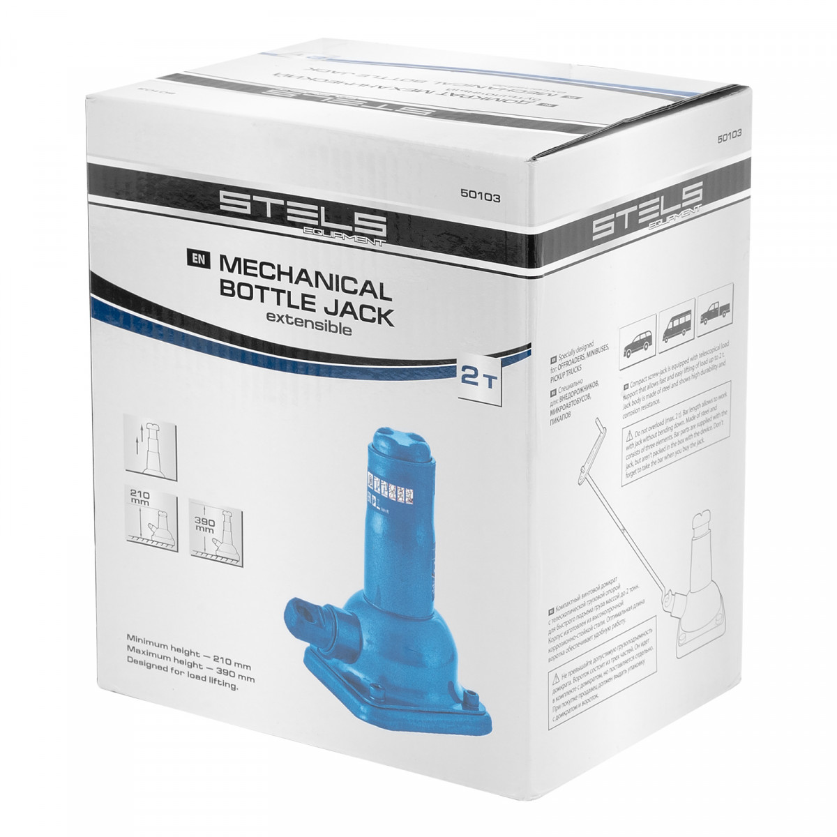 Механический бутылочный домкрат Stels 50103 состоит из 2-х частей: самого домкрата и ручки, имеет телескопический шток и используется для быстрого подъема грузов массой до 2 т на высоту 210-390 мм. В комплект входит вороток из трех частей для работы в труднодоступных местах. Домкрат предназначен для самостоятельного применения, будет полезен владельцам легковых автомобилей в дороге и гараже.