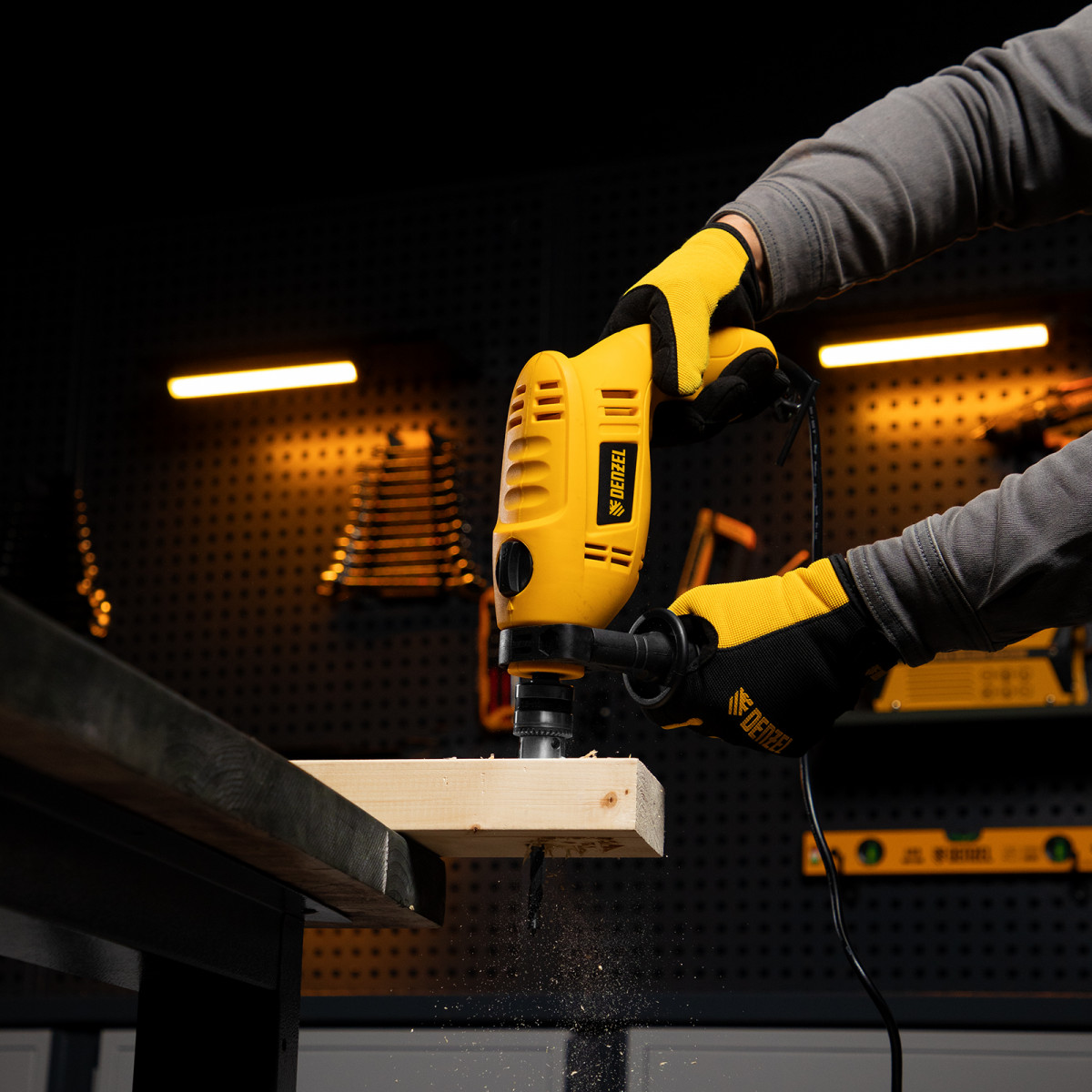 • Комфортная работа — обрезиненная боковая рукоятка не выскальзывает из руки, дрель весит 1,7 кг, что позволяет долго работать без ощущения усталости.
