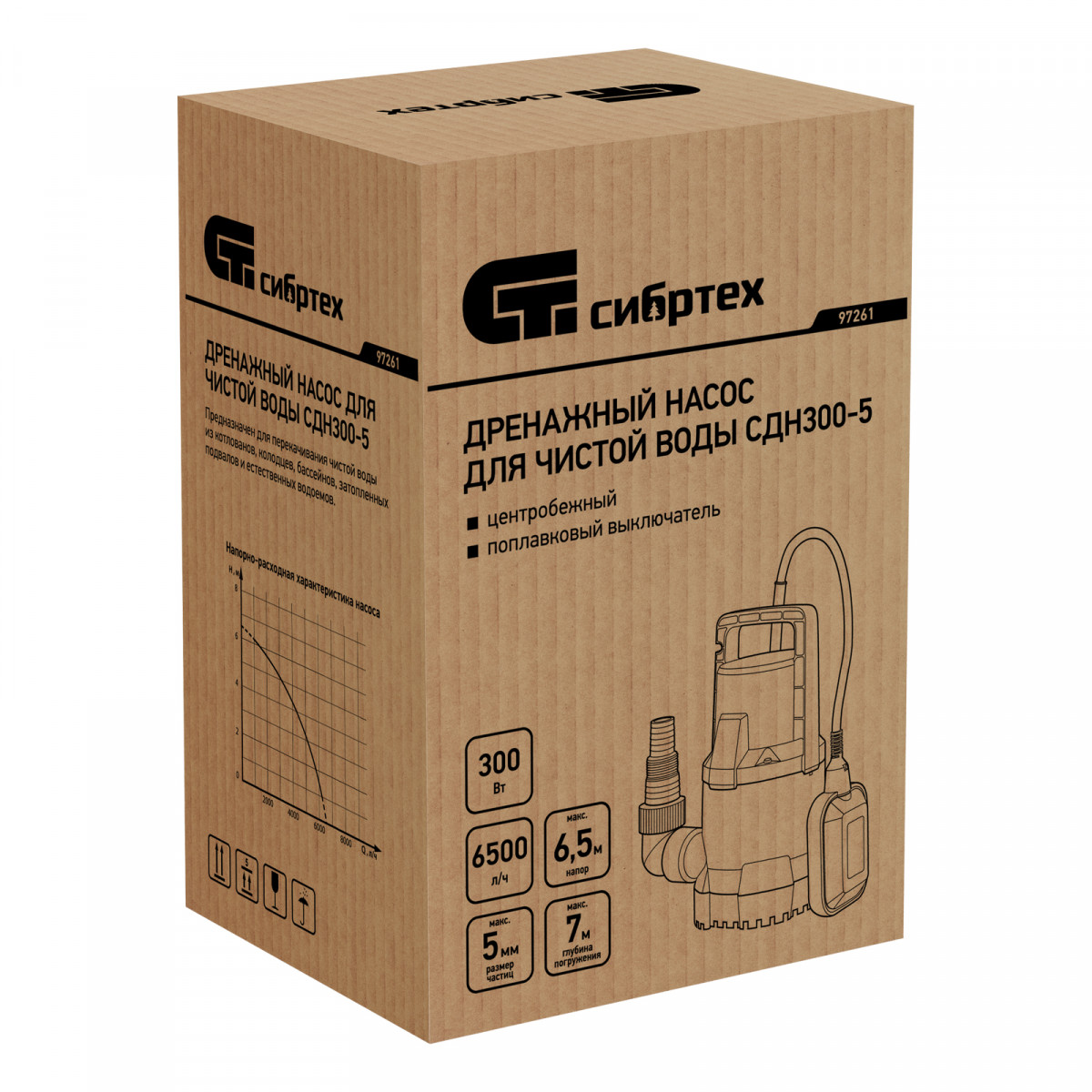 Дренажный насос для чистой воды СДН300-5, 300 Вт, напор 6.5м, 6500 л/ч Сибртех