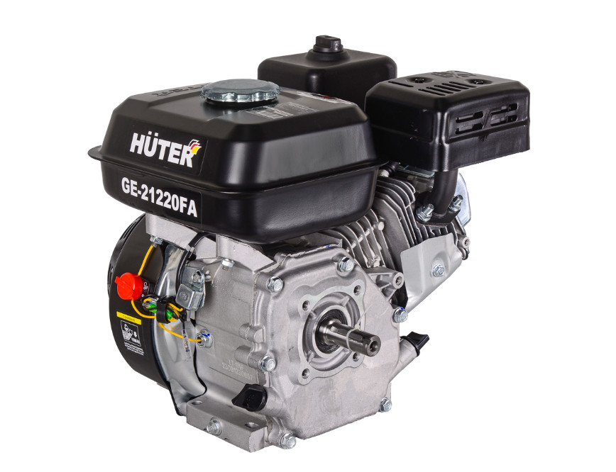 HUTER GE-21220FA – модель бензинового двигателя с выходным валом в виде шпонки, ориентированного на работу в качестве силового агрегата снегоуборщиков, культиваторов, мотопомп и другой техники, используемой в приусадебном хозяйстве. Агрегат компактный, обладает отличными техническими характеристиками и эксплуатационными качествами.Двигатель одноцилиндровый, 4-тактный, с воздушным охлаждением, объёмом 212 см³, мощностью 7 л.с. и с бензобаком объёмом 3.6 л. Он отличается надёжностью, простотой управления и способен обеспечить бесперебойную работу техники без дозаправки в течение длительного времени. Диаметр выходного вала составляет 20 мм. Объём масляного картера – 0.6 л.Модель HUTER GE-21220FA оснащена металлическом коленвалом из высокопрочной стали и усиленной поршневой группой с хромированным покрытием, поэтому обладает повышенным рабочим ресурсом. Стартер двигателя ручной. Для удобства эксплуатации имеется автоматический регулятор частоты вращения вала и встроенный датчик уровня масла, не позволяющий пр