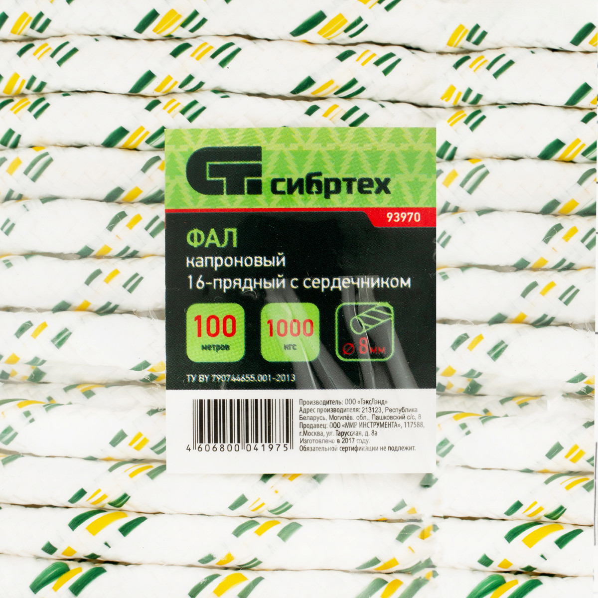 Фал плетёный капроновый с сердечником, 8 мм, L 100 м, 16-прядный, Сибртех