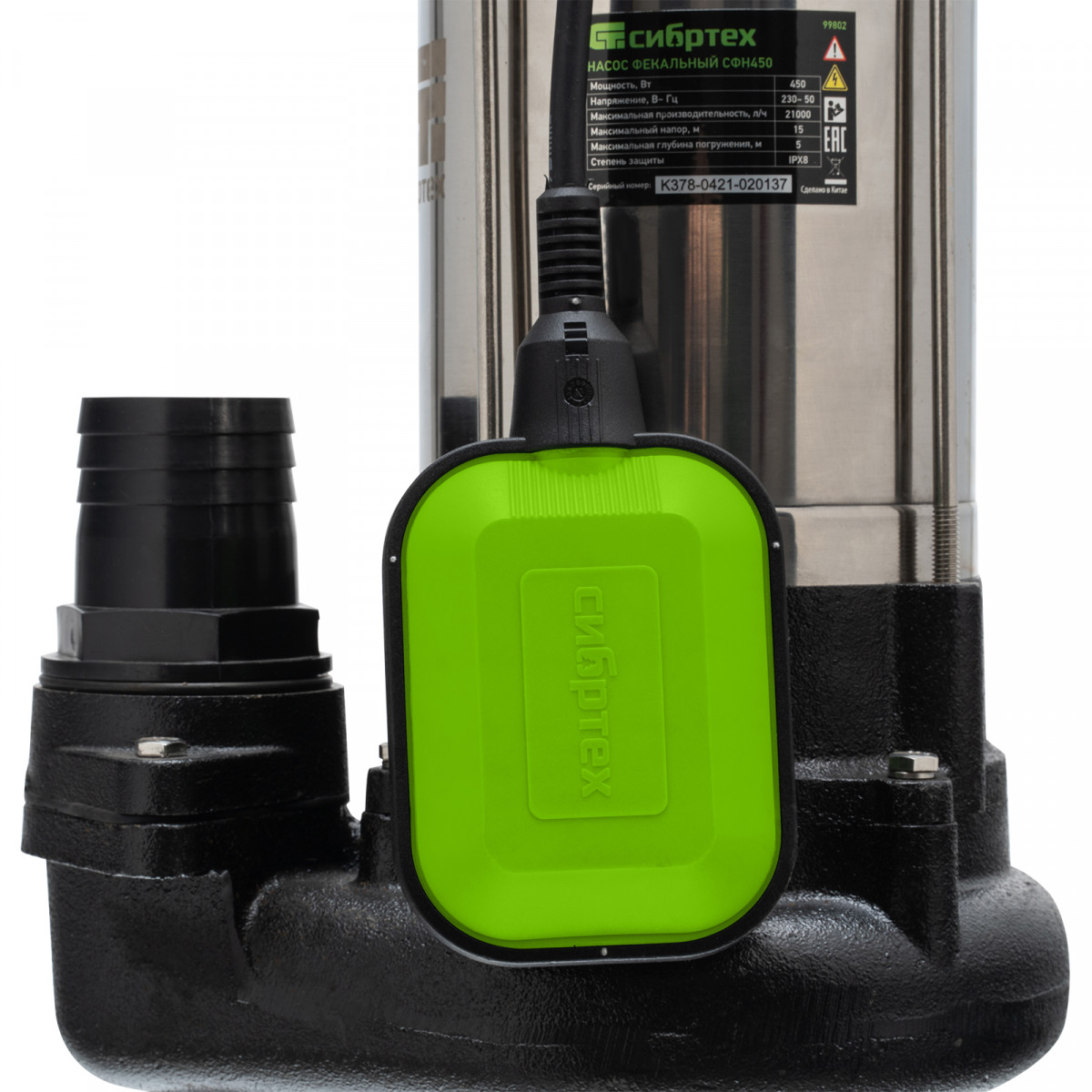 Фекальный насос Сибртех СФН450 99802 мощностью 450 Вт и производительностью 21000 л/ч обеспечивает напор до 15 м, совместим со шлангами диаметром 2 дюйма и предназначен для перекачивания грязных бытовых, сточных и смешанных вод с частицами диаметром до 25 мм. С помощью насоса можно организовать дренажную систему осушения затапливаемых помещений, принудительную канализационную систему на даче или систему автоматического полива с несколькими точками водоразбора. Также он используется для откачки нечистот из выгребных ям, стоков и канализаций. Насос способен работать с холодными стоками температурой не выше 35 градусов.