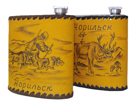 Фляга покрыта кожей, с нанесенным изображением.