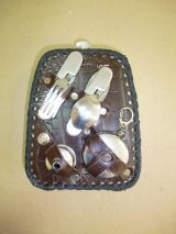 Фляжка из нержавеющей стали, обшитая натуральной кожей, с художественным оформлением. В комплект входит: воронка, стакан складной, складная ложка и вилка