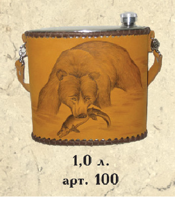 Фляжка(1.0л) из нержавеющей стали, обшитая натуральной кожей, с художественным оформлением.