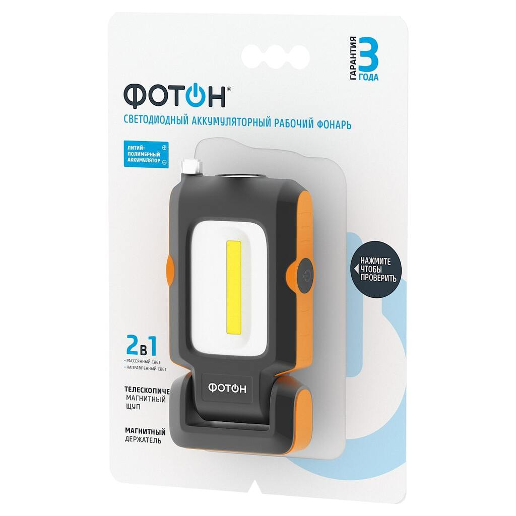 Дополнительные технические характеристики: Может светить рассеянным (3 Вт) или направленным (1 Вт) светом. Зарядка аккумулятора - от USB. Поворот на 180°. Телескопический магнитный щуп. Крюк для подвешивания. Магнитный держатель. Клипса для крепления на ремень. Защита разъема зарядки от влаги и пыли.