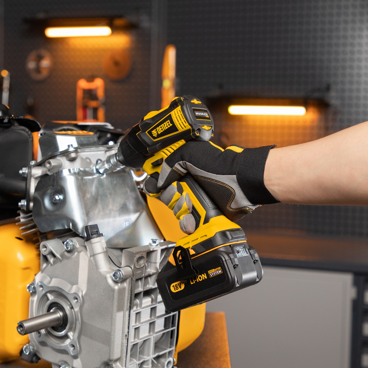 - Полная готовность к работе — в комплект входит зарядное устройство, аккумулятор, адаптер HEX 1/4 дюйма и 4 ударные торцевые головки размером 17, 19, 21 и 22 мм.