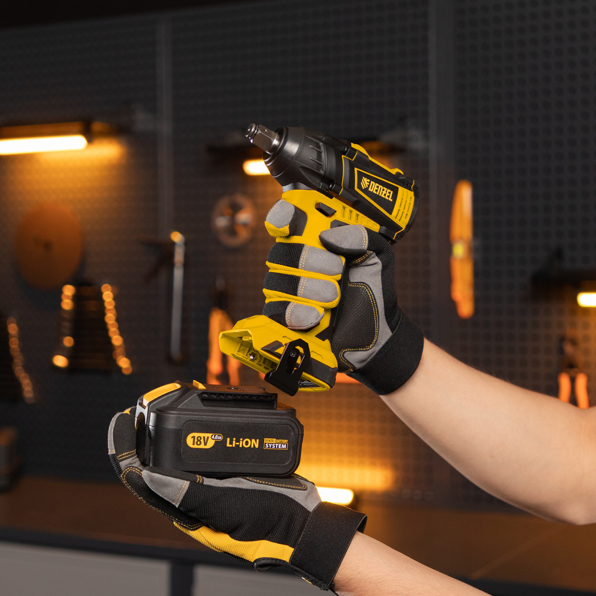 - Универсальность — аккумулятор 4 А/ч Li-ion совместим с любым инструментом 18V Denzel battery system серии IB.
