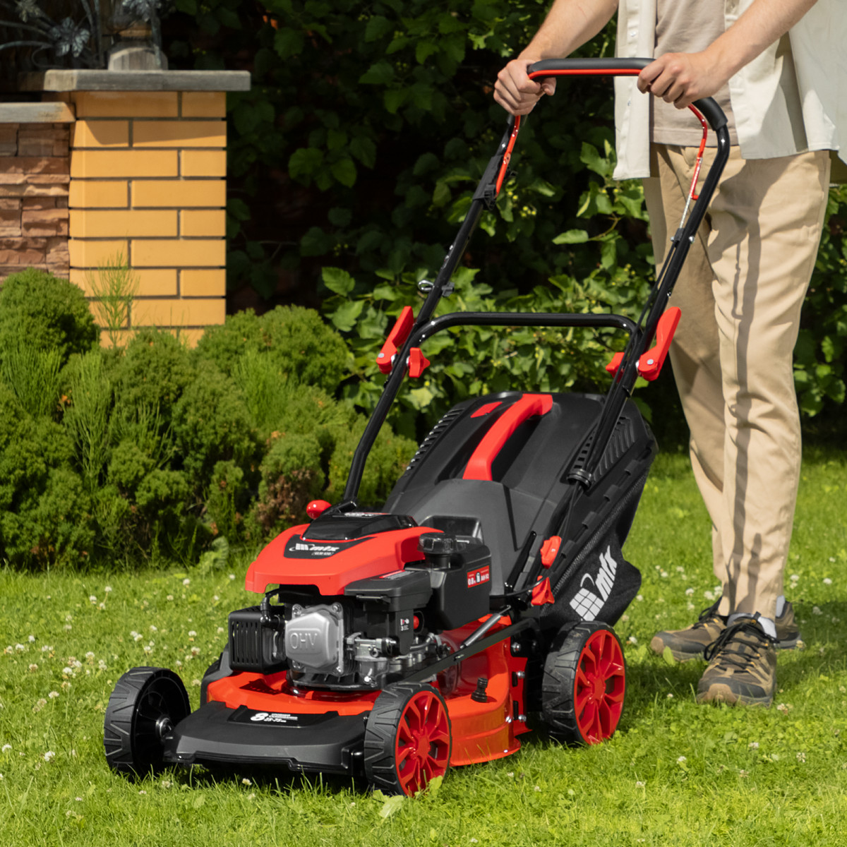 - 4 режима — возможен сбор скошенной травы в травосборник, задний выброс, боковой выброс, оптимальный для заготовки сена, и мульчирование для последующего удобрения почвы.
