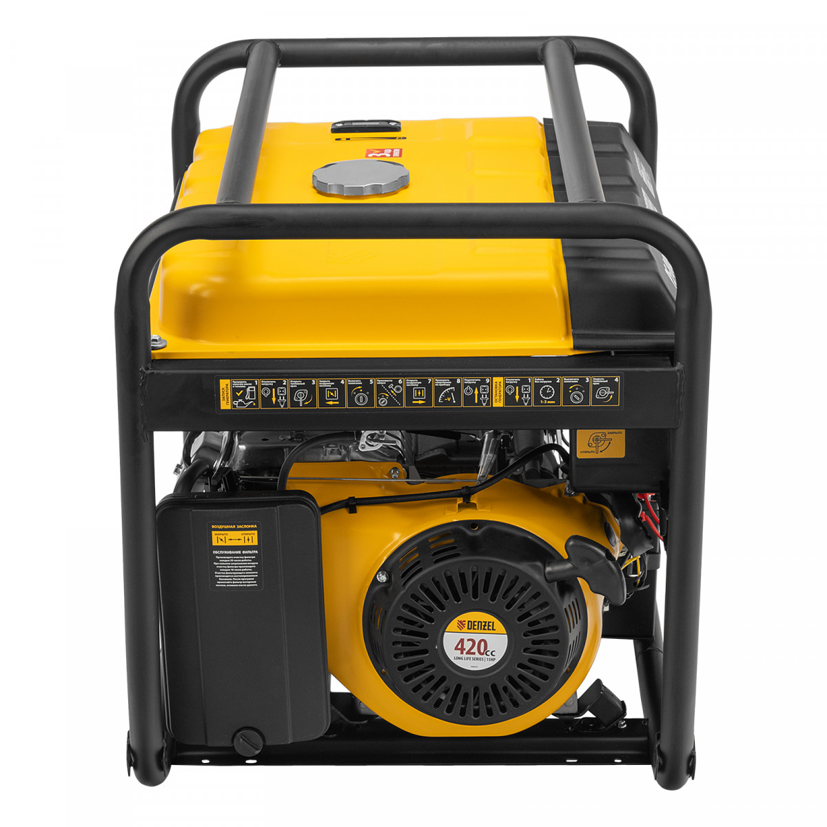 • Долговечность — двигатель повышенной мощности Denzel Long Life объемом 420 см3 обеспечивает стабильную работу генератора в течение длительного времени.