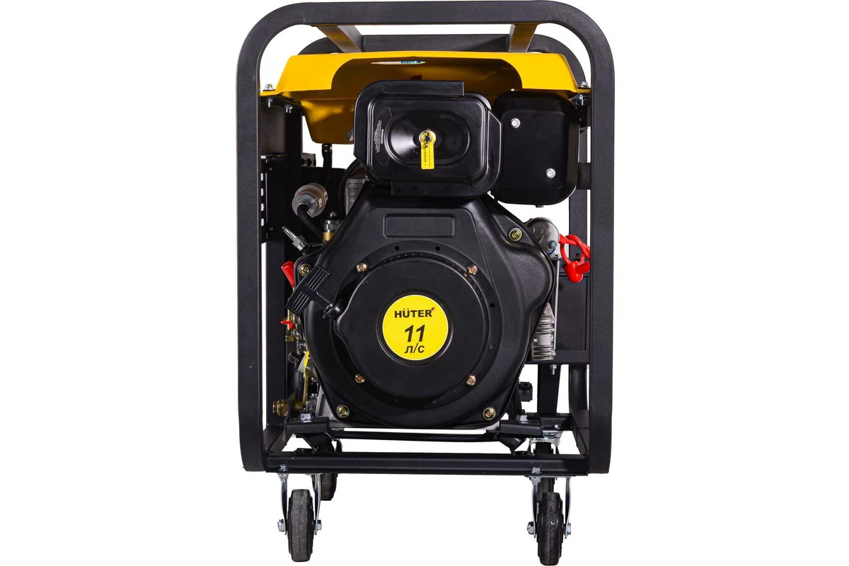 Дизельный генератор данной модели относится к переносным электростанциям, но его вес составляет 114,8 кг. Комплектуется комплектом колес для удобства перемещения. Запускается от ручного и электростартера, работающего от аккумулятора 12 В. Емкость для смазочной жидкости вмещает 1700 мл. Благодаря этому, генератор Huter LDG 7000LXА может работать длительное время без дозаправки.