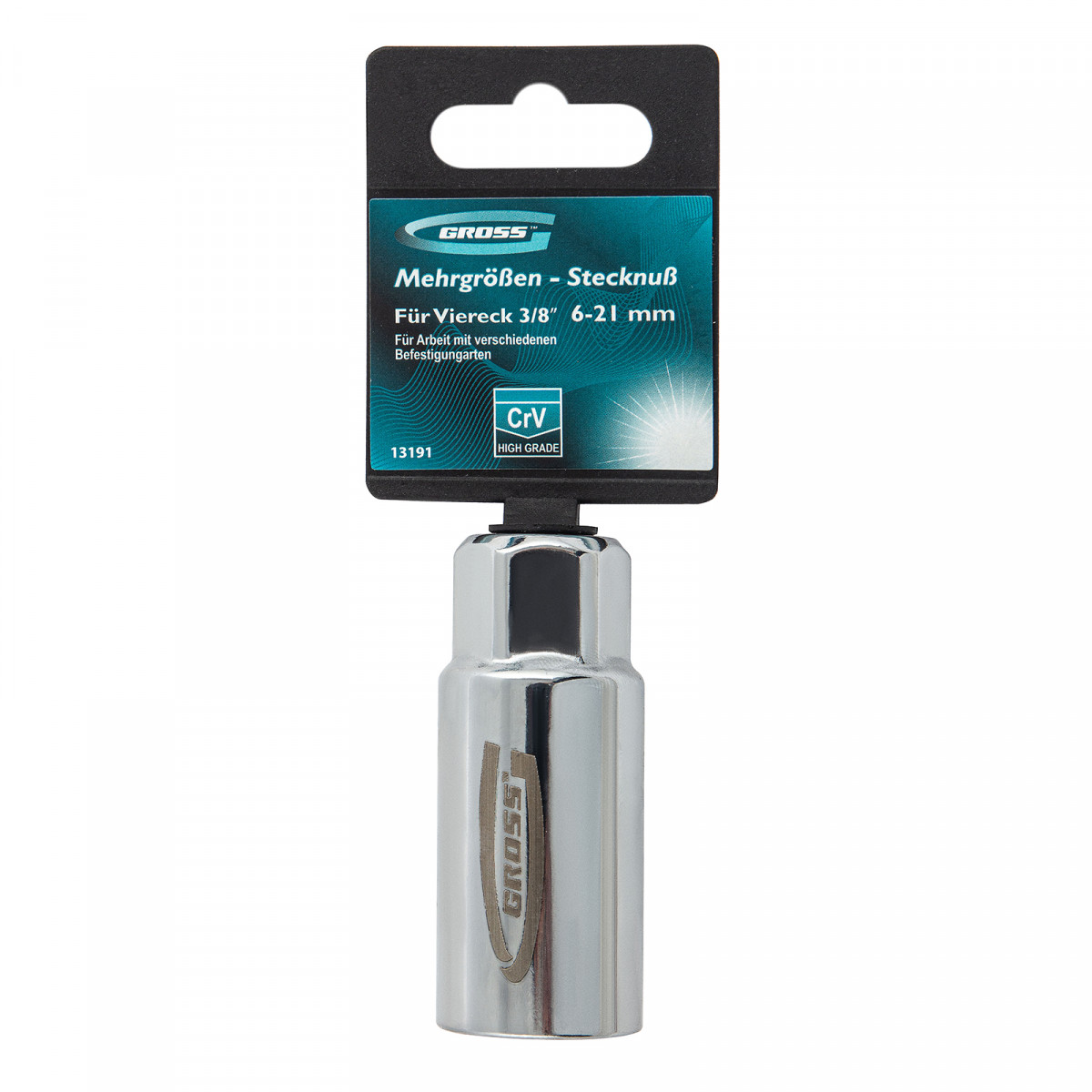 Головка торцевая многоразмерная, CrV, 6-21 мм, под квадрат 3/8, CrV, хромированная Gross