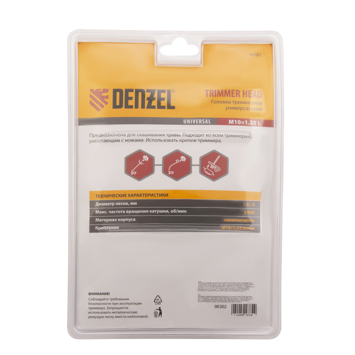 Универсальная триммерная головка Denzel 96362 с закладной гайкой М10 х 1,25 с левой резьбой подходит к большинству моделей электро- и бензокос. Заправляется режущей леской толщиной до 3 мм, поэтому эффективна как для подравнивания газона, так и для скашивания высоких зарослей травы.