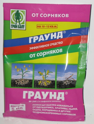 "Граунд" полностью уничтожает любые сорняки, включая их надземные и подземные части. Действует по зеленым растущим сорнякам. Попадая на растение, "Граунд" проникает в зеленые листья и стебли сорняков и разносится по всему растению, включая корневую систему. Препарат блокирует синтез веществ в клетках растения, и оно гибнет. Обработанные сорняки желтеют через 7-14 дней, а через 15-25 дней полностью отмирают