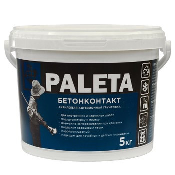 Грунтовка Paleta бетонконтакт подходит для обработки всех типов поверхностей (кирпич, дерево, металл, керамическая плитка, поверхности, покрытые краской, белилами);