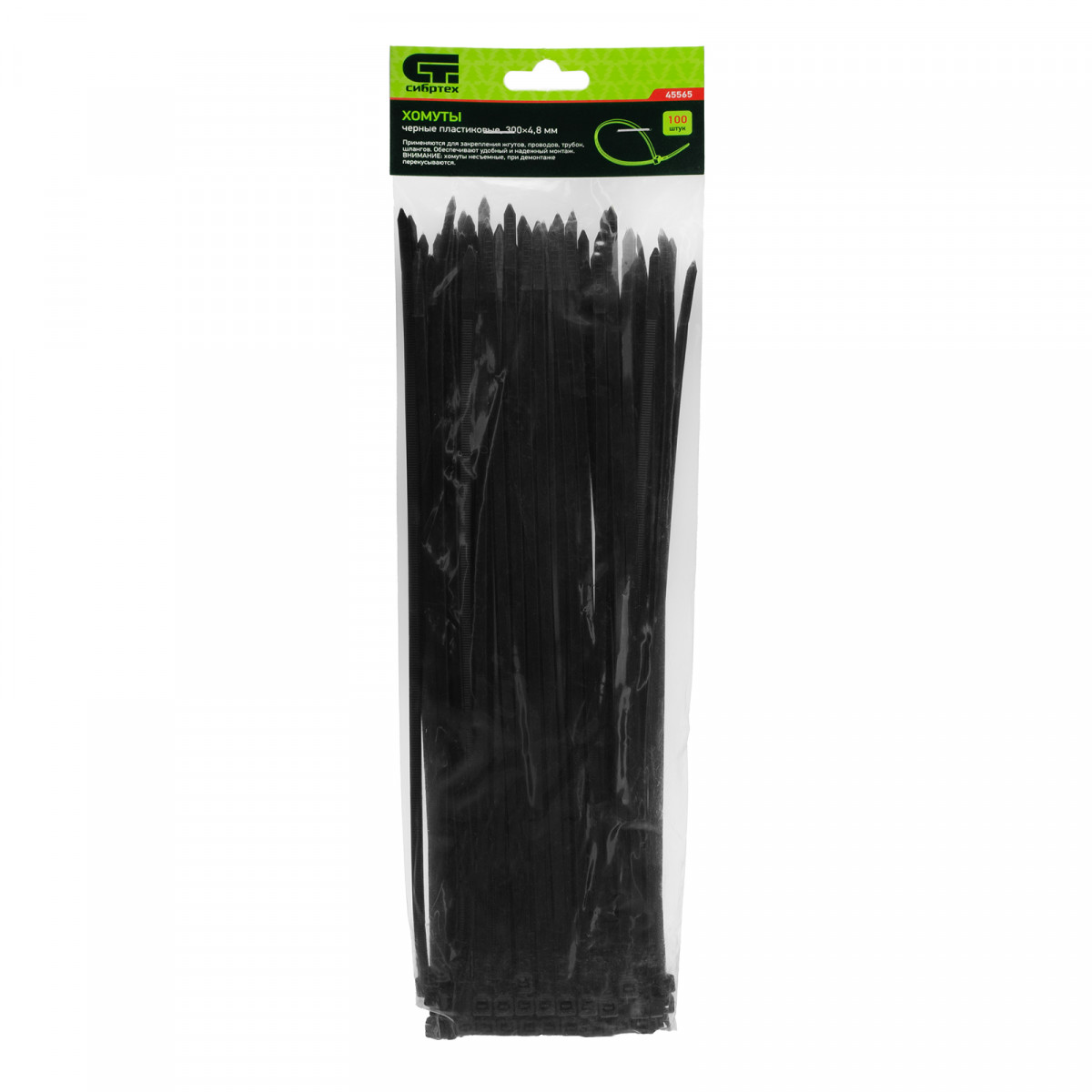 Черные пластиковые хомуты Сибртех 45565, 100 х 4,8 мм, 100 шт. в упаковке, используются для стяжки кабелей, закрепления трубок, шлангов, рекламных конструкций, а также для упаковки различных предметов. Пригодятся во время прокладки электрических и локальных вычислительных сетей, ремонта компьютерной техники, оформлении торговых стендов, комплектовании товара, будут также полезны дома, на даче и в гараже.