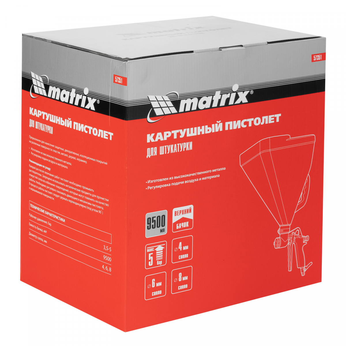 Картушный пистолет Matrix 57351 с объемом бака 9,5 л и соплами 4, 6 и 8 мм предназначен для нанесения штукатурки, вязких красок и других растворов. Высокая скорость распыления материала позволяет быстро обрабатывать участки большой площади. Инструмент используется для проведения отделочных работ.