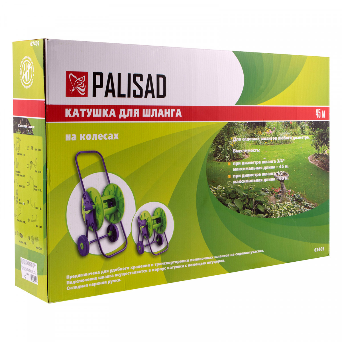 Катушка Palisad 67405 на колесах упрощает работу с поливочным шлангом длиной до 45 м. Позволяет регулировать его длину во время работ на участке, а также обеспечивает бережное хранение, предотвращая перекручивание и запутывание. Боковая рукоятка облегчает разматывание и наматывание шланга.