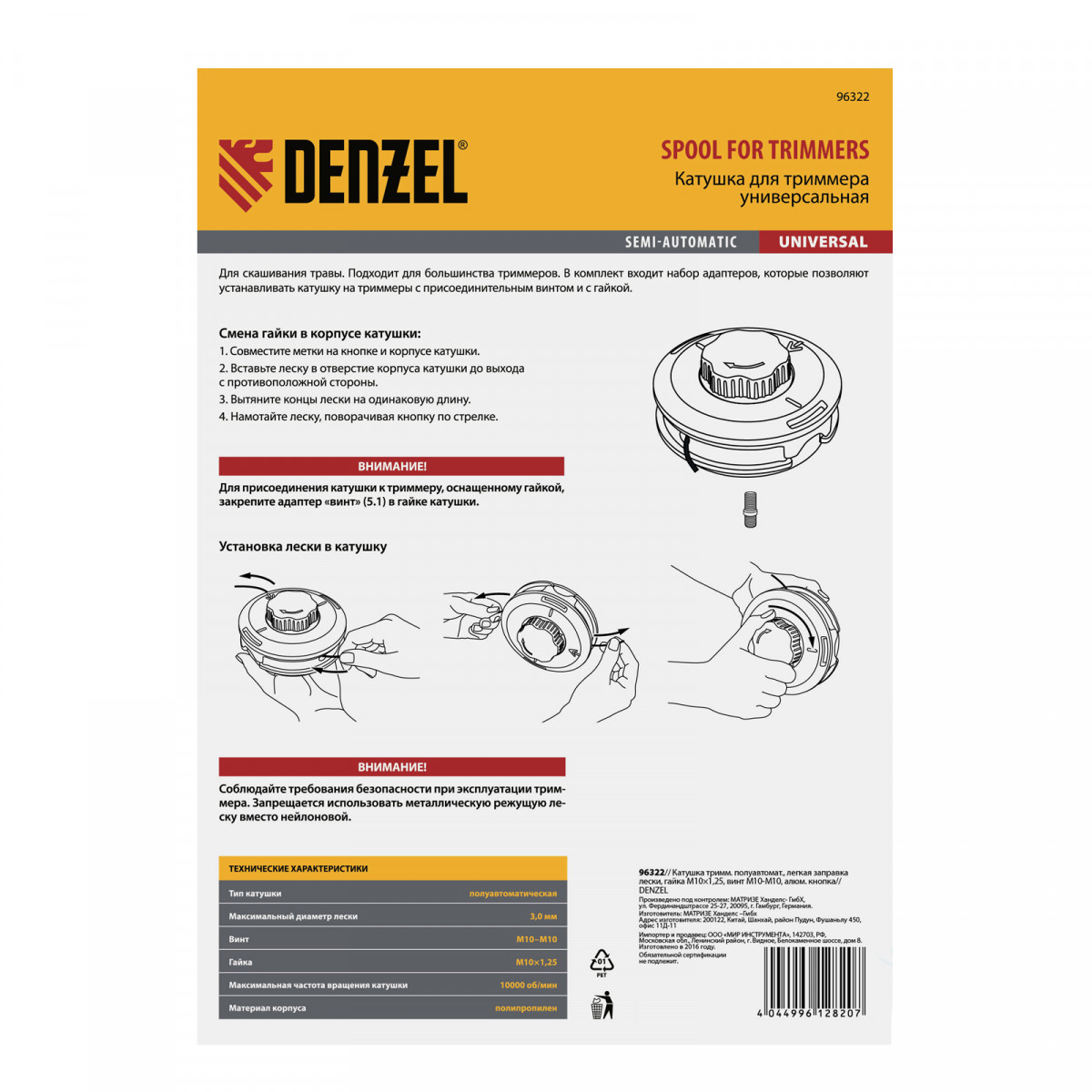 Полуавтоматическая триммерная катушка Denzel 96322 совместима практически с любой электро- и бензокосой благодаря наличию адаптера «папа-папа» М8-М10 с левой резьбой. Неважно, установлен на триммере присоединительный винт или гайка — катушка подойдет к обоим типам инструмента.,Катушка заправляется леской толщиной до 3 мм, поэтому легко справиться не только с газонной, но и с многолетней высокой травой. Пользователь может выбрать леску с такими типами сечения, как круг, квадрат, треугольник, пятиугольник, клевер и др.